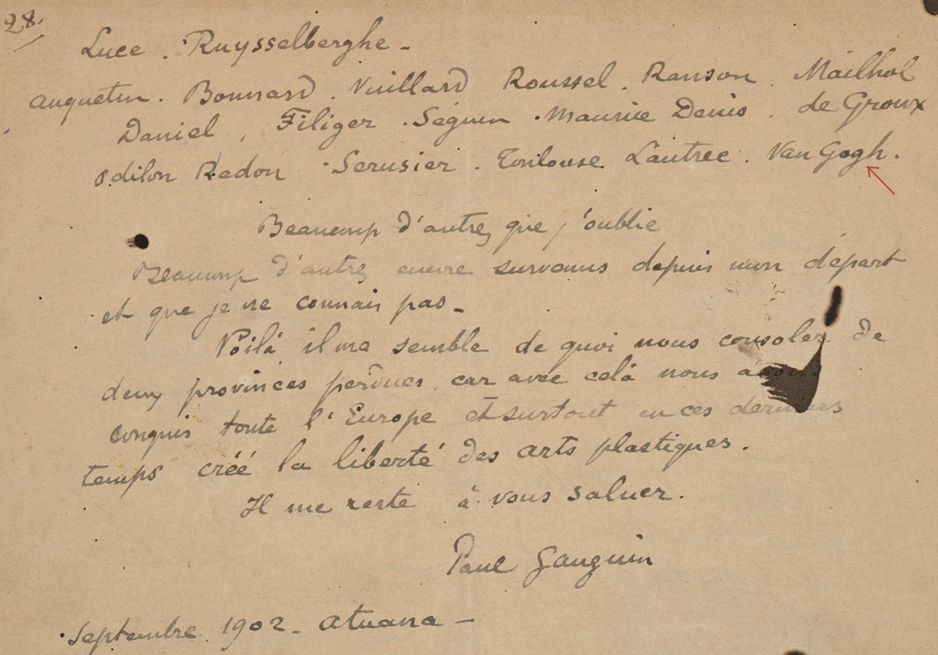 In Tales, Gauguin lists 40 artists he admires. Van Gogh is included at the very end of the list, although nothing more is said about him, despite the fact that Gauguin lived and worked with him for nine weeks in the autumn of 1888. Their collaboration came to an abrupt end when Van Gogh mutilated his ear.