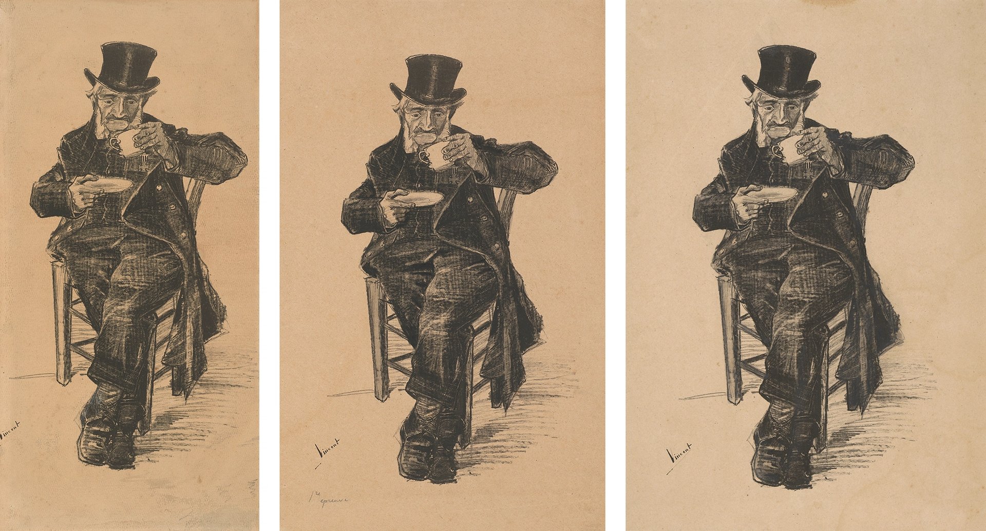 Three prints of Van Gogh’s Old Man drinking Coffee (autumn 1882), with the promised donation on the right Credit: Van Gogh Museum, Amsterdam (Vincent van Gogh Foundation) and (right) Monique Hageman, on long-term loan to the Van Gogh Museum