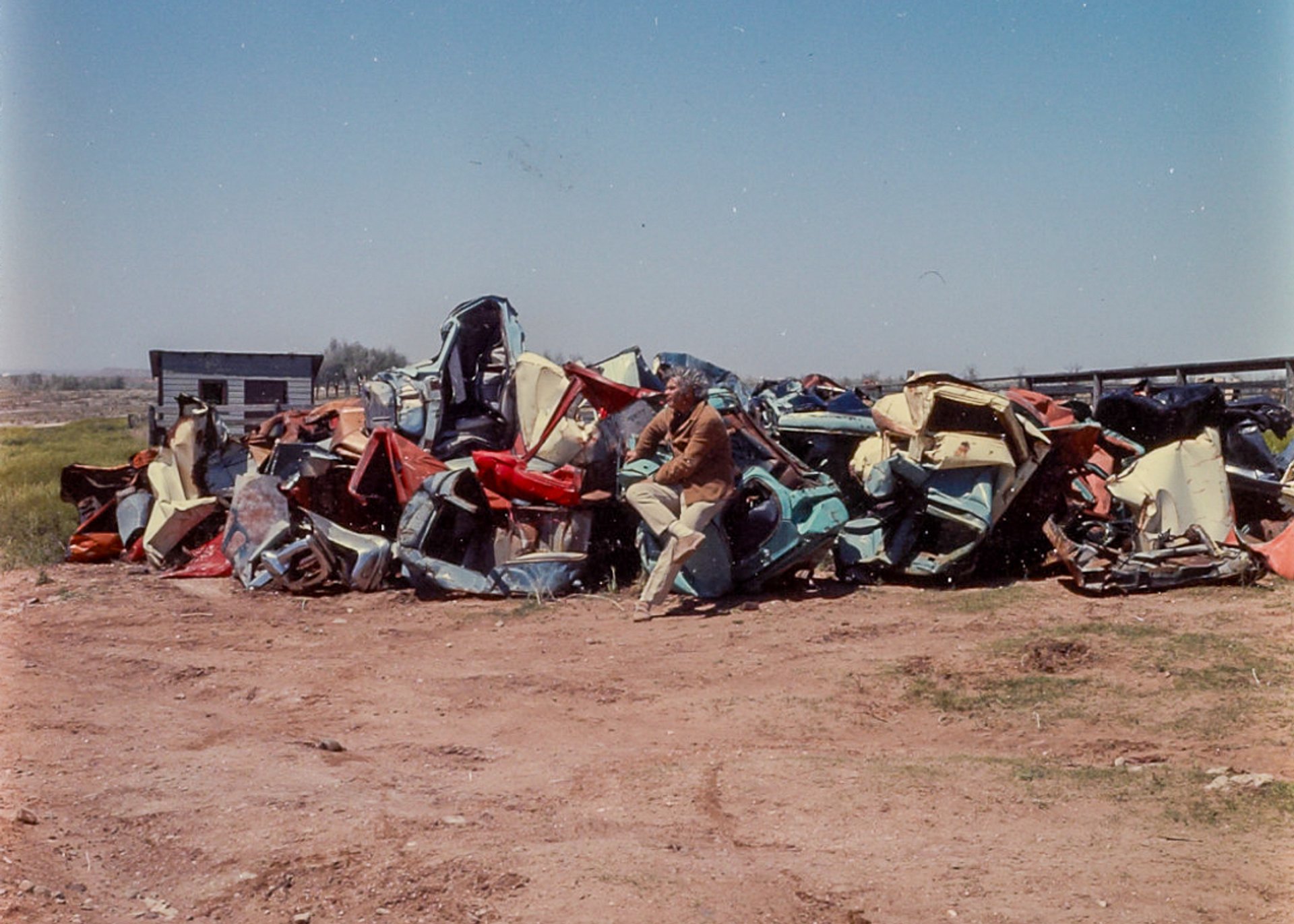 Chamberlain among his raw materials at Stanley Marsh 3's ranch, Toad Hall, Amarillo, Texas, 1972.