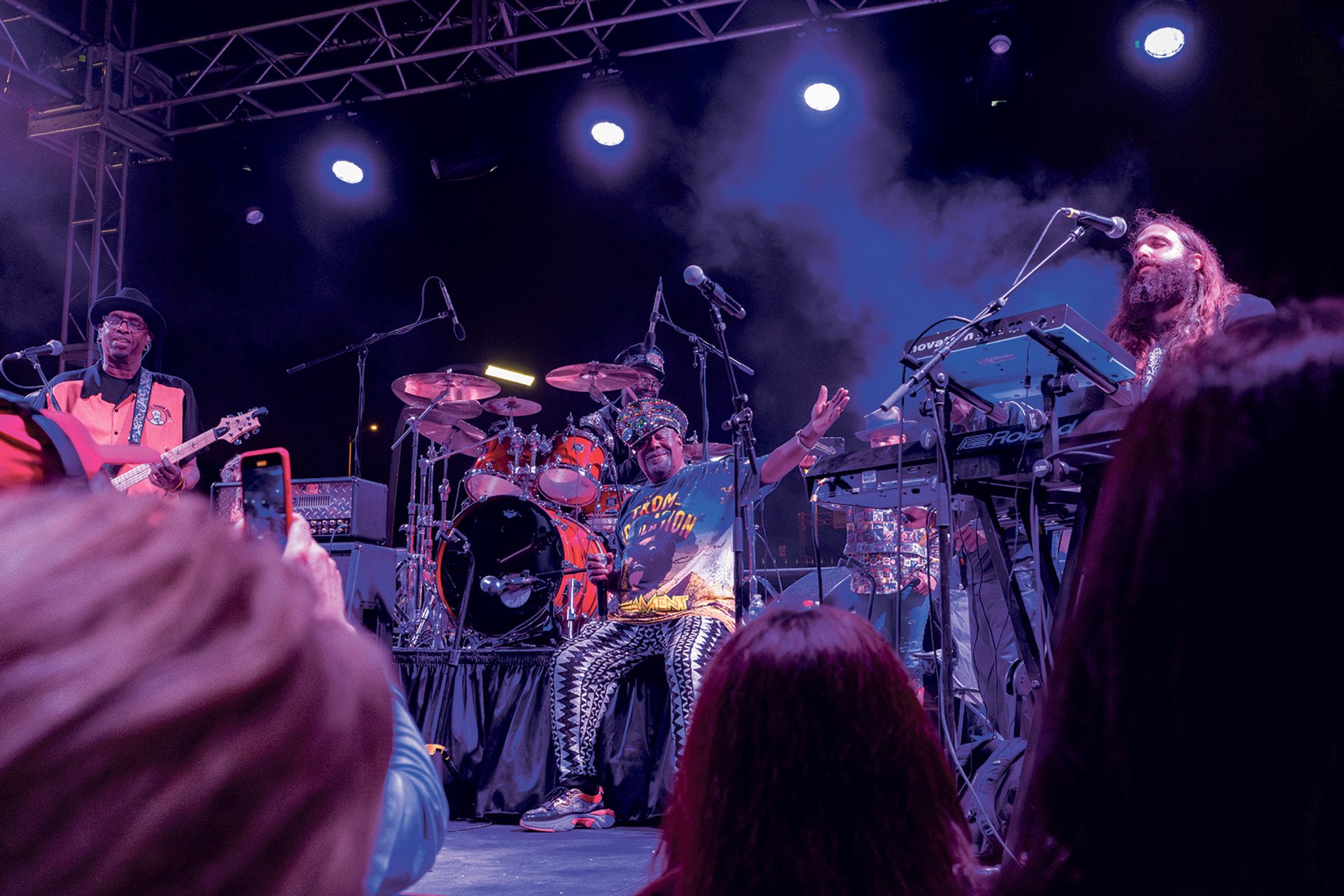 George Clinton brought the house down at Miami Art Week’s biggest bash, held at the Pérez Art Museum Miami (PAMM) on Thursday night. The artist and funk maestro took to the stage late in the evening and delivered a riproaring headline set on the museum’s riverside terrace. The jubilant crowd—many of whom had endured a lengthy queue to see the great man—whooped, cheered and danced (awkwardly) as the group reeled through hits including We Want the Funk and Atomic Dog. Sensational music wasn’t the only thing on offer, either. Guests also enjoyed free drinks and late-night access to the museum, which recently opened the major retrospective Gary Simmons: Public Enemy.