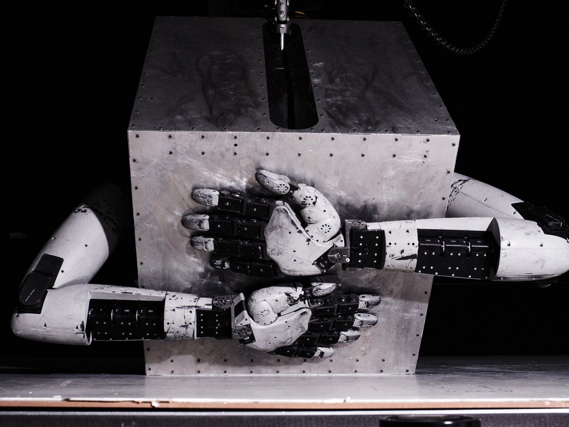 Advanced robotics and computer programming by Wolfson’s team of experts allow the hands’ finger movements to be extraordinarily delicate and poetic. Except when the cube appears angry, clenching its fists and bashing its chest. Or when it appears to descends into melancholy, and points two fingers at itself as though to shoot a gun.