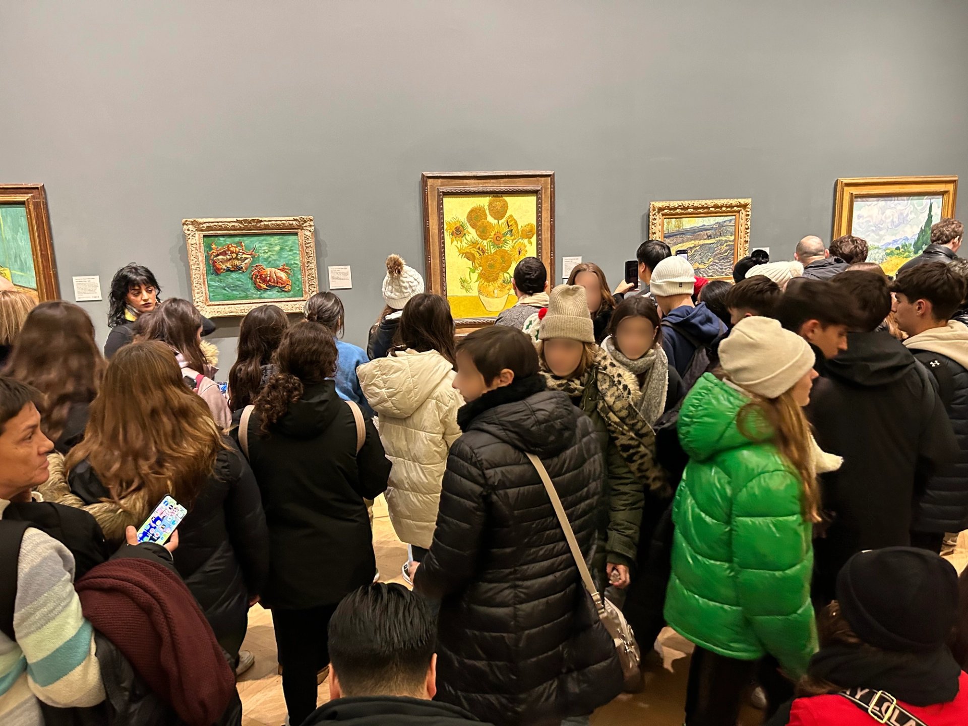 I used to say that the floor in front of the Sunflowers gets scuffed more than that by any other National Gallery picture. Sadly, now there is more evidence on the floor of the painting’s celebrity. On 14 October 2022 Sunflowers was the victim of a protest by climate activists who threw tomato soup at it. Fortunately glass protected the artwork, although the 17th-century frame suffered minor damage. The frame was promptly restored, but there still remain signs of marks on the wooden floor immediately below the picture.