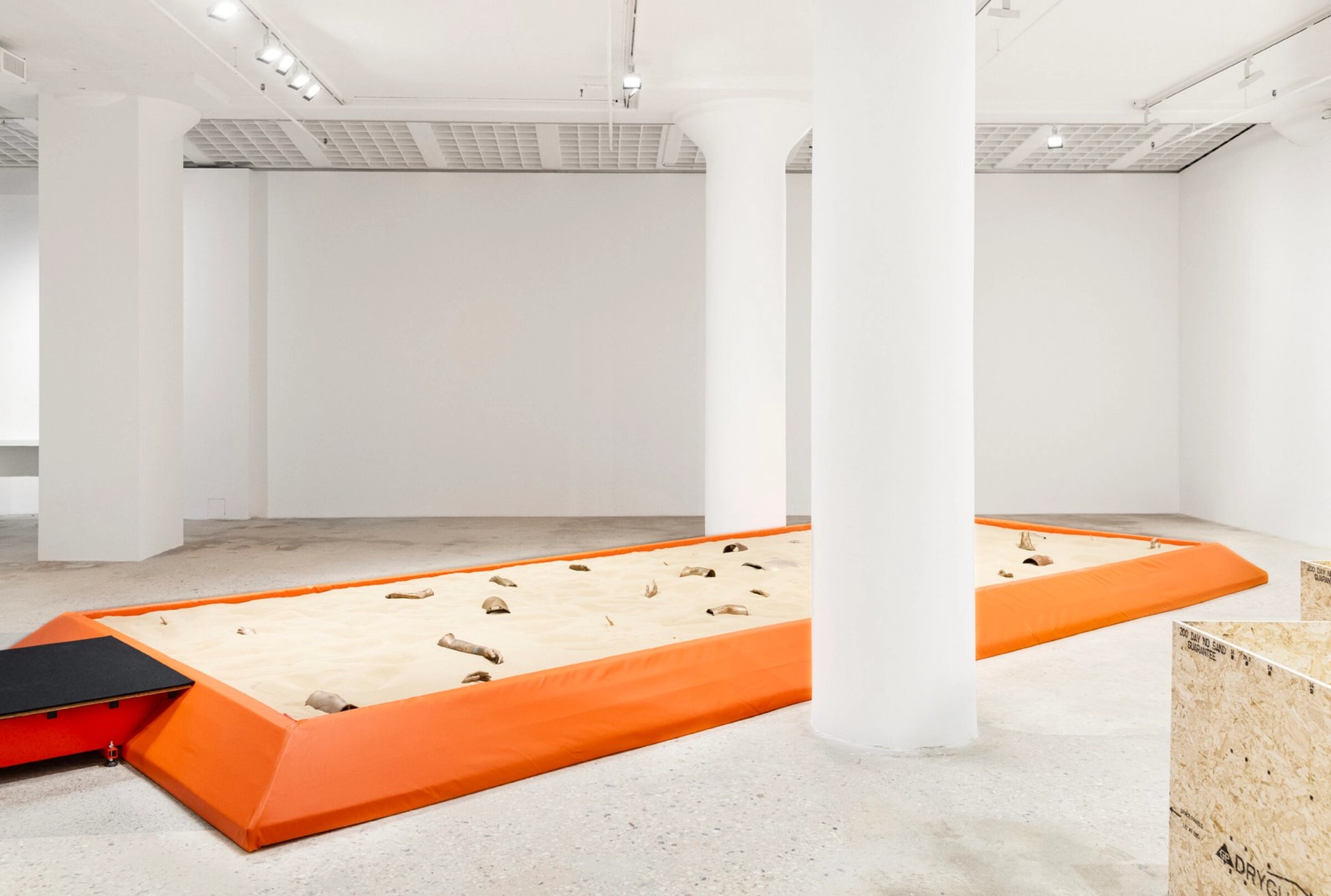 That was clear to such opening night guests as the Dia Foundation’s Donna de Salvo, the Sculpture Center’s Sohrab Mohebbi and the Art Basel director Maike Cruse, who were forced to circumnavigate the jump in small groups and contemplate three awkwardly placed chipboard crates of more sand, each built to resemble a sarcophagus and bearing the stencilled words “NO SAND”.