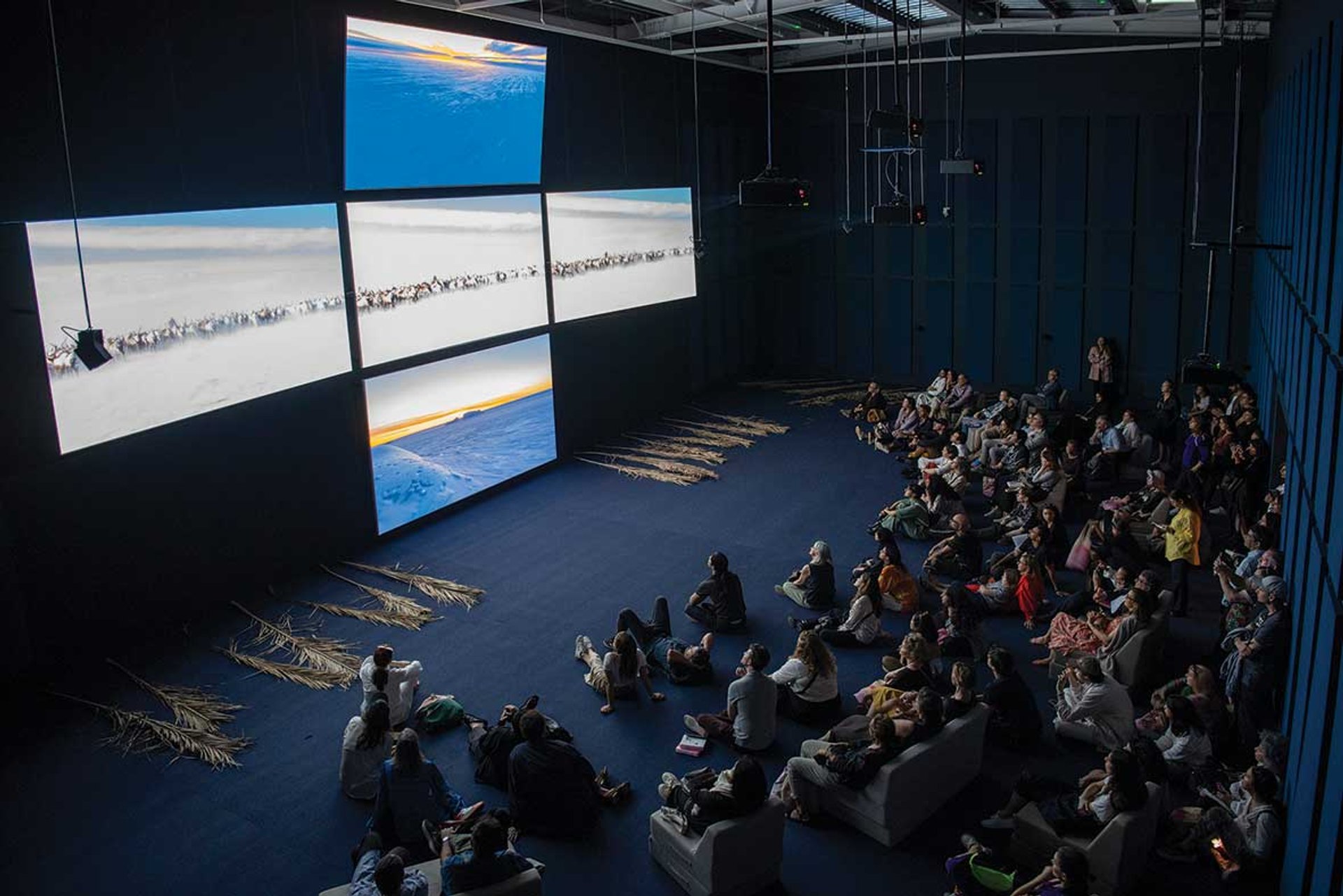 Fateful crossing: the film Arcadia (2023), screened across five channels set out as a crucifix. The film, exploring the story of European colonialism, was premiered at the Sharjah Biennial last year and is now showing at the Box in Plymouth