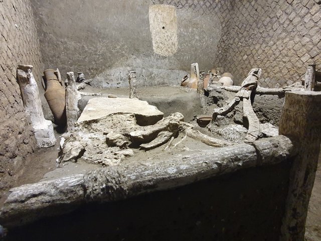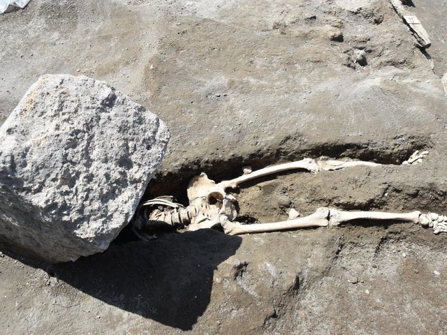 New excavations in Regio IX began early last year when the skeletons of two men thought to be in their mid 50s were discovered in a cluster of homes known as Insula dei Casti Amanti. A fresco painting showing a lavish meal with a pizza-like bread at its centre was also unearthed in Regio IX last year.