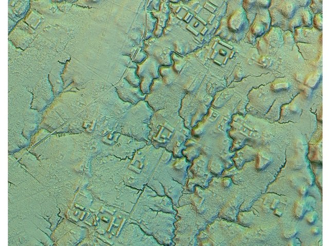 Kunguints site, Upano Valley, Ecuador. Dug streets crosse the urban area where they are bordered by complexes of rectangular platforms arranged around low squares Image: Lidar, A. Dorison and S. Rostain