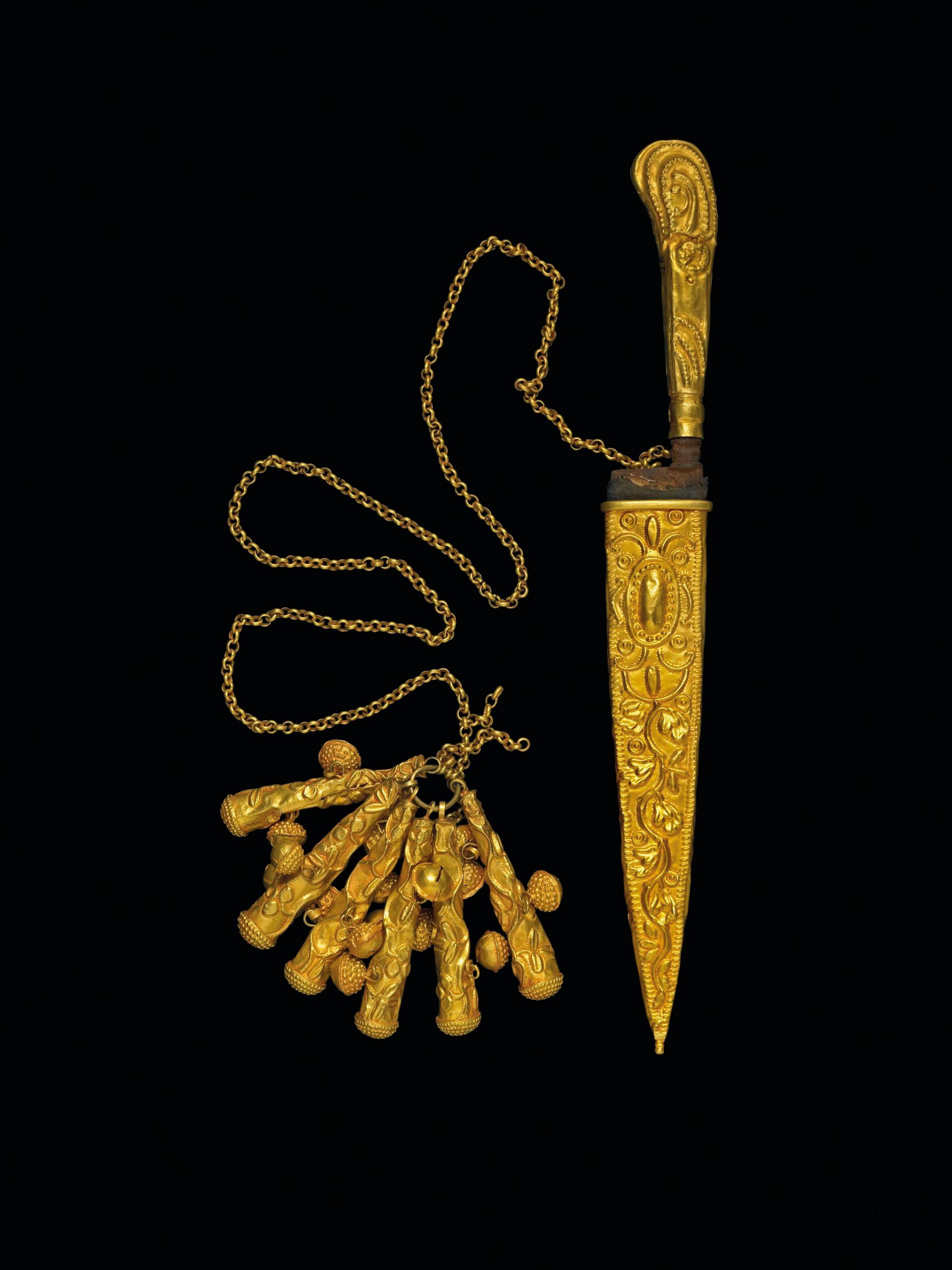 The BM is lending 15 objects, again mostly made of gold. They include a sword armature, a ring, a sheath ornament, a knife, two swords, two caps, two necklaces and four soul discs. Four of these items were acquired in 1874-76, seven in 1900-02 and the latest was a necklace bought in 1942 from a London silversmith for £42.