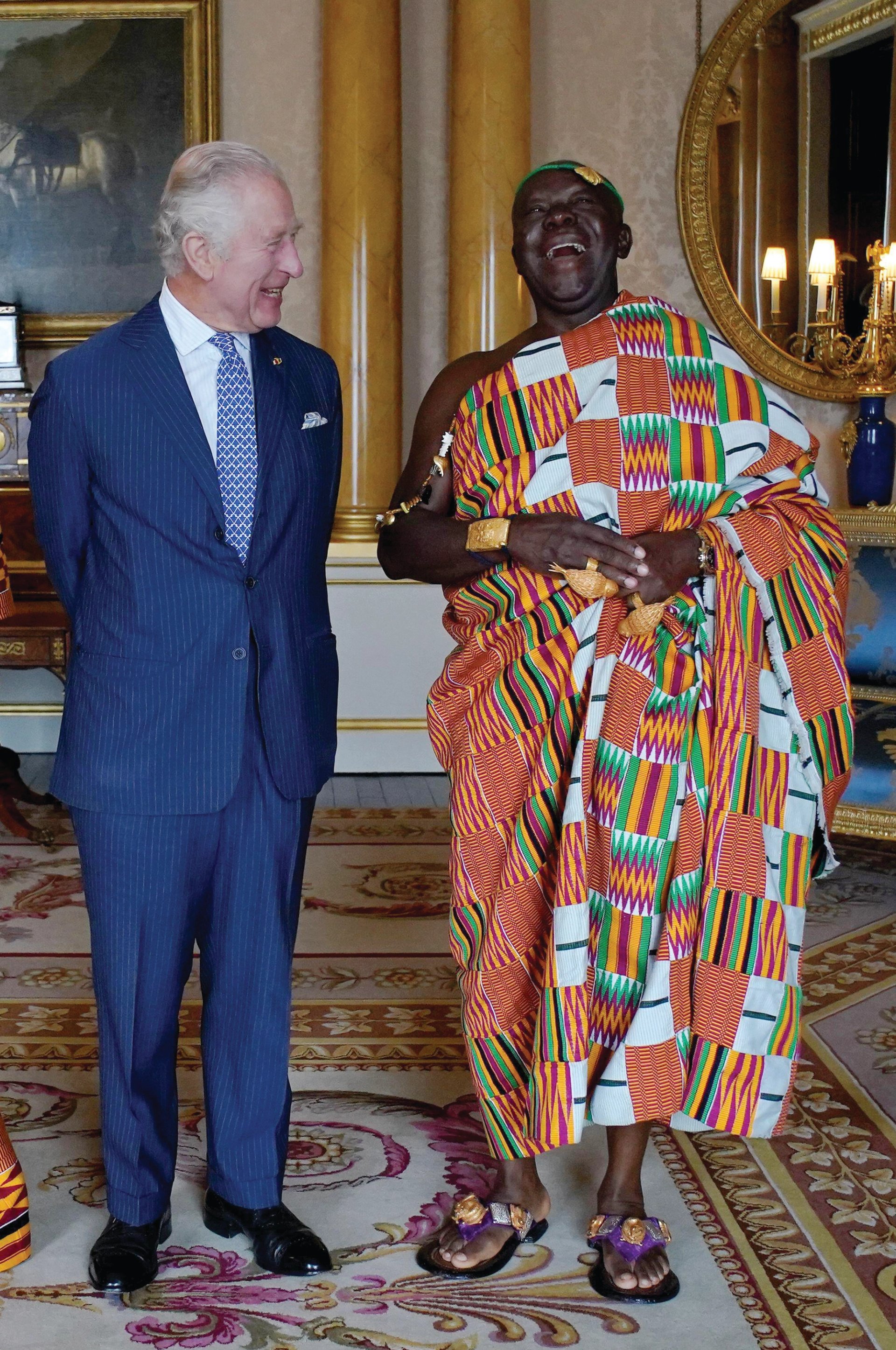 A meeting of kings: Asantehene Osei Tutu II at an audience with King Charles III at Buckingham Palace, 4 May 2023. On his London visit, the Asantehene also met with the British Museum and the V&A to finalise the loan arrangements © PA Images/Alamy Stock Photo