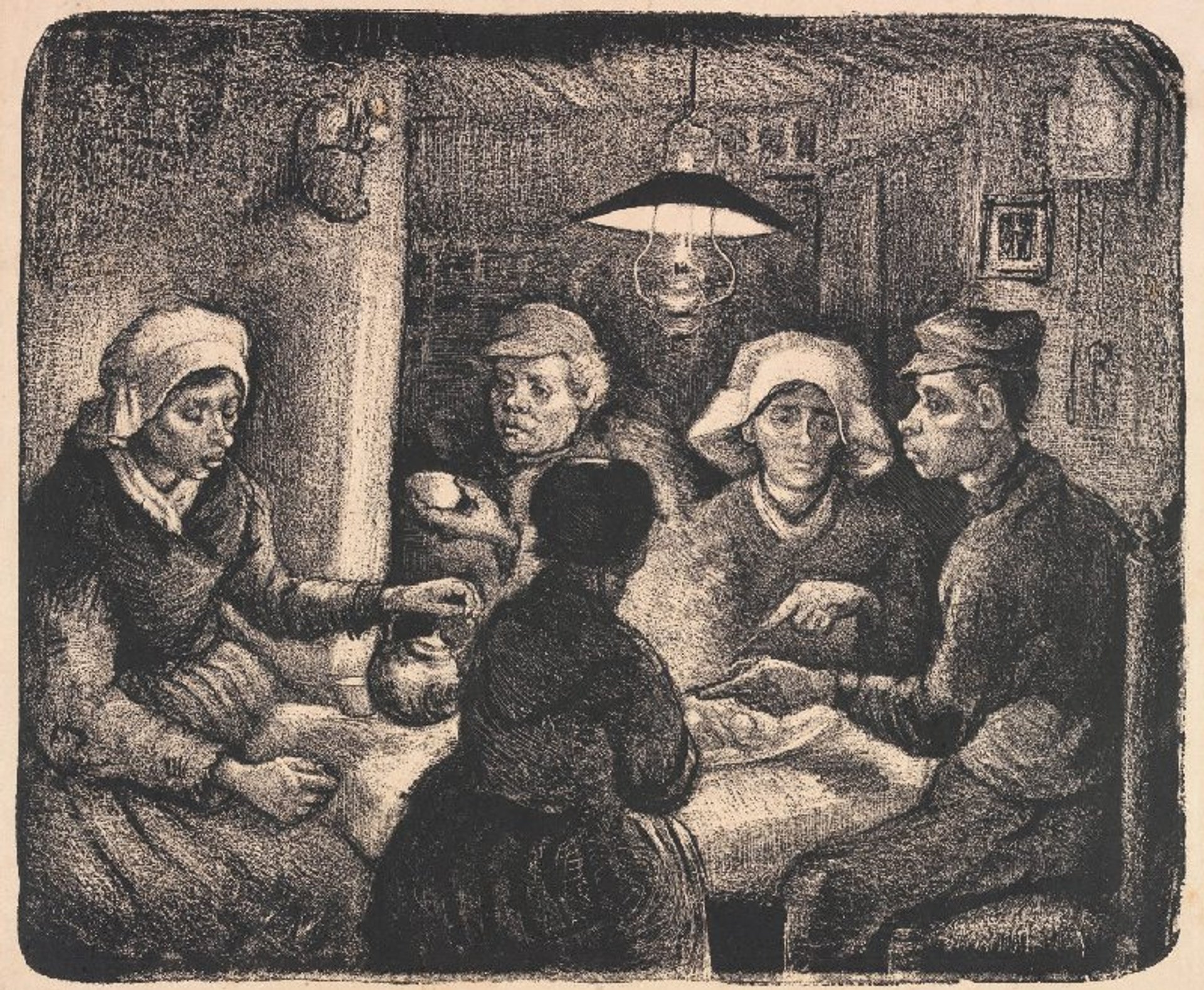 Van Gogh’s lithograph of The Potato-Eaters (April 1885), with Gordina de Groot towards the right in the print
