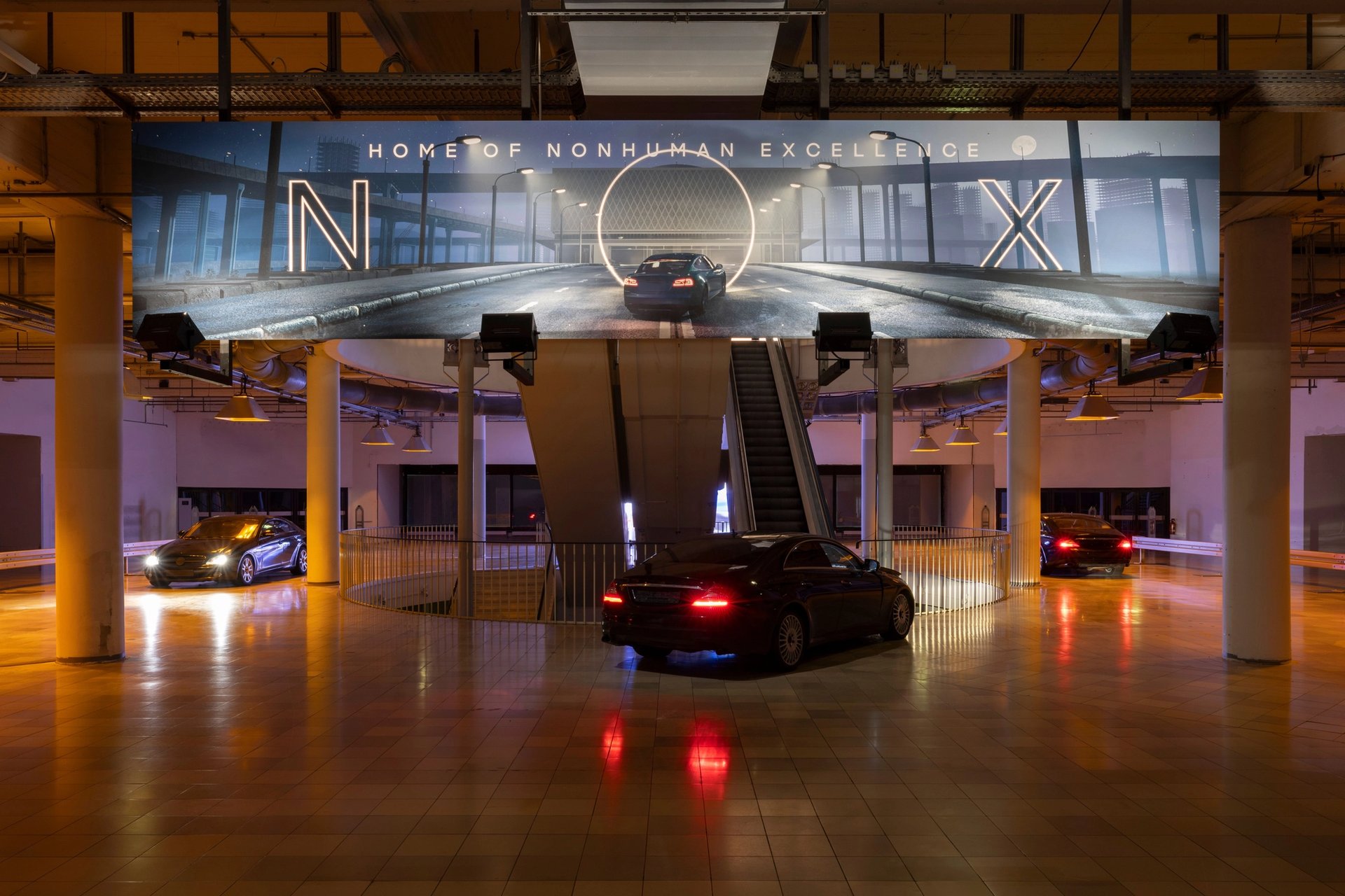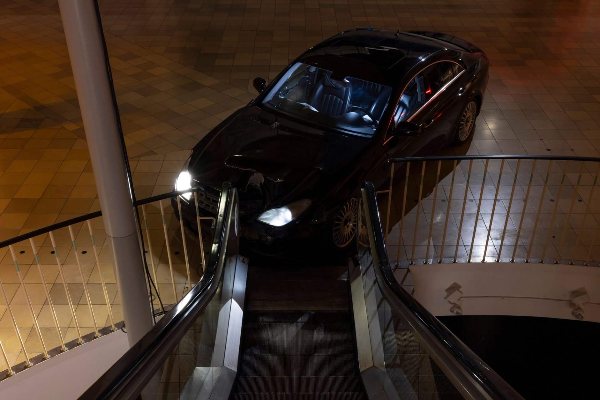 A black Mercedes crashed into a pillar with its airbags ejected. This is the image that greets visitors to Lawrence Lek’s exhibition Nox, for which the London-based artist has taken over three floors of a disused sporting goods store in west Berlin. Commissioned by the LAS Art Foundation, a nomadic art organisation that focuses on technology and science, the show is the latest in which Lek uses speculative fiction to explore topics of artificial intelligence (AI) and digital worlds—this time taking self-driving cars as his subject.