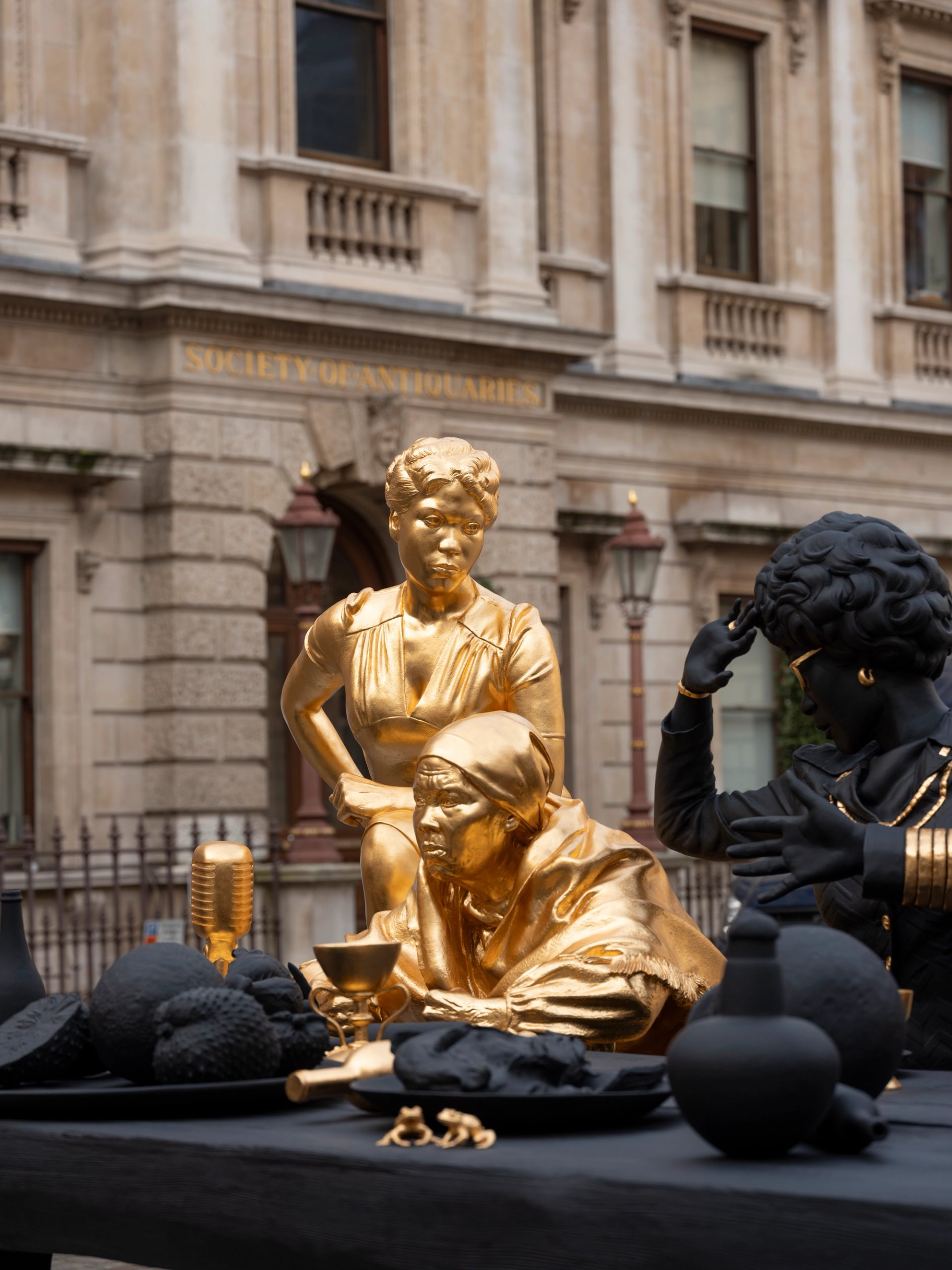 Strachan’s piece—crafted from bronze, black patina and gold leaf—is a “monument to the singular contributions of 12 Black figures from the 17th century to the present day… they have in common histories of overcoming power structures designed to keep them oppressed”, writes the art historian Alayo Akinkugbe in the exhibition catalogue.