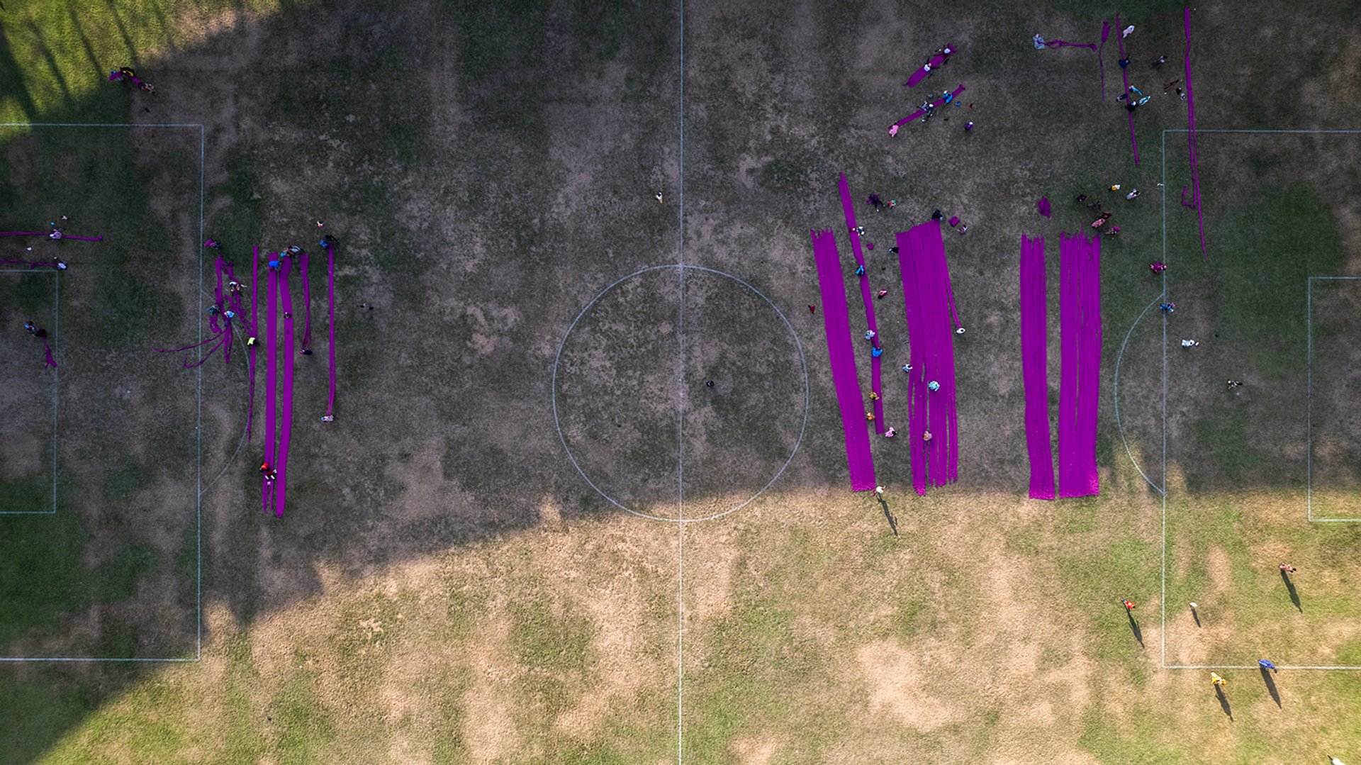 The work also references the 2003 novel of the same name by Nigerian author Chimamanda Ngozi Adichie. In Adichie's book, the purple hibiscus symbolises freedom and hope for the oppressed characters. “I chose the book to inspire the colour of the work and the patterns of the smocks.” Mahama tells The Art Newspaper.