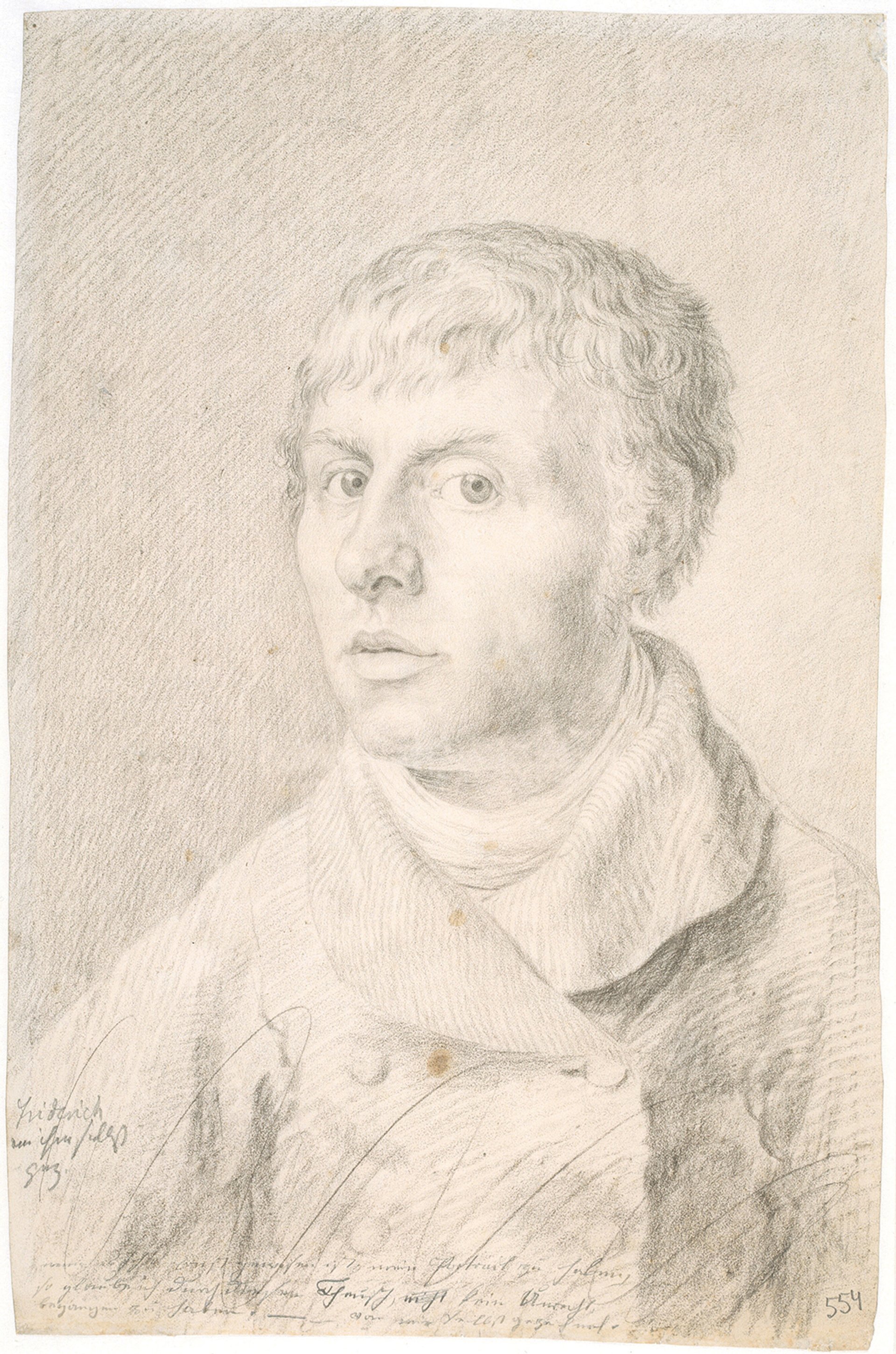 Friedrich was born in what was then a Swedish-controlled outpost of northern Germany. He studied in the 1790s at the Academy of Fine Arts in Copenhagen, where draughtsmanship was put far ahead of painting. In a stark self-portrait drawing from 1800, he still looks like an art student, catching himself in a fierce, vulnerable pose.