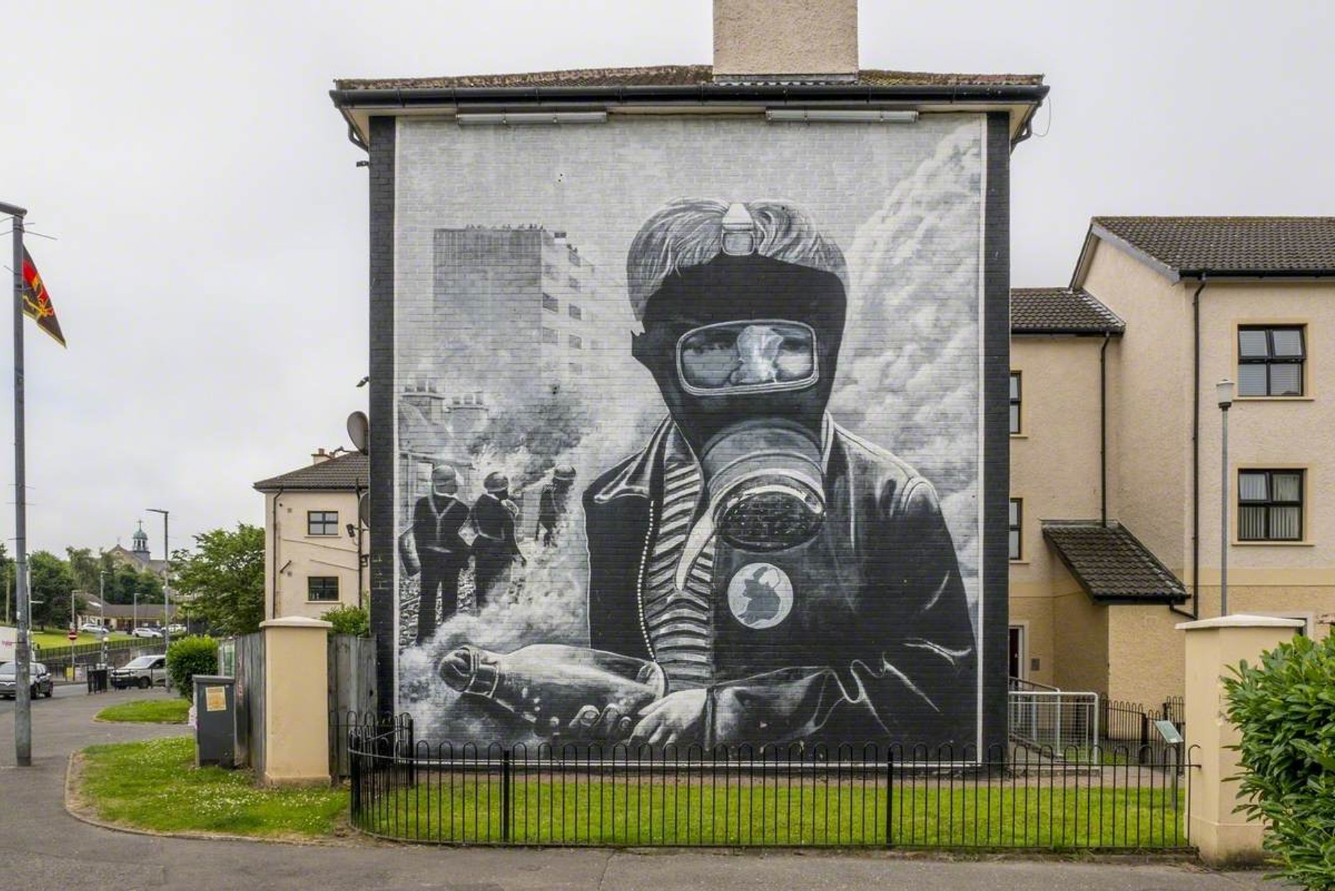aWilliam Kelly, Tom Kelly and Kevin Hasson‘s The Petrol Bomber (1994) is an example of Northern Ireland's murals, many of which are tied to histories of cultural and political unrest. This particular mural references the Battle of the Bogside, a riot which broke out in Derry in 1969 and is often seen as the beginning of the 30-year conflict known as the Troubles