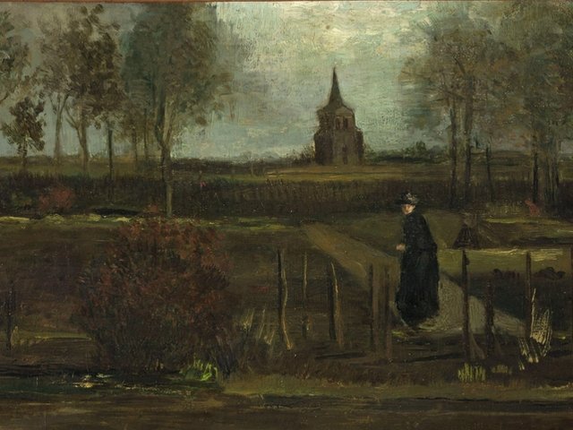 The landscape, painted in Van Gogh’s early, dark tones, was created when he was living with his parents in the village of Nuenen, in the south of the Netherlands. It depicts the back garden of his father’s parsonage, with the tower of the old church in the distance. The figure of a woman, dressed in black, is shown walking away.