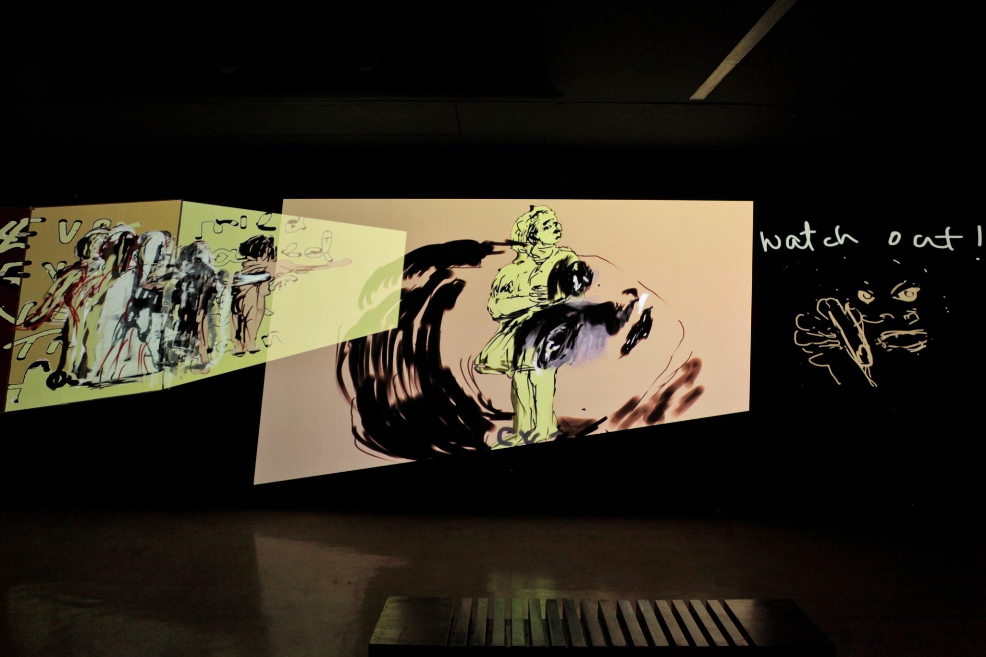 She is increasingly celebrated for her installations that she calls “animation chambers”, fusing video and drawings, text and voice. They engulf the viewer in environments that contain endlessly shifting sequences of imagery and stirring soundtracks—a call to action in terms of both their political and cultural content.