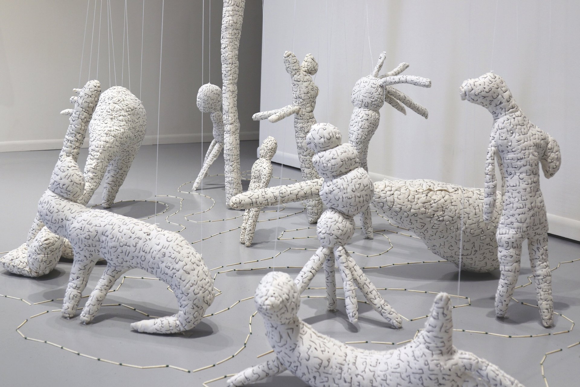 The nine Iranian expatriate artists in this exhibition use characters, forms and fragments from the Persian alphabet as the building blocks for their works, which range from drawings and installations to materials more typically associated with crafts, such as tiles, paper sculptures and fabric puppets.
