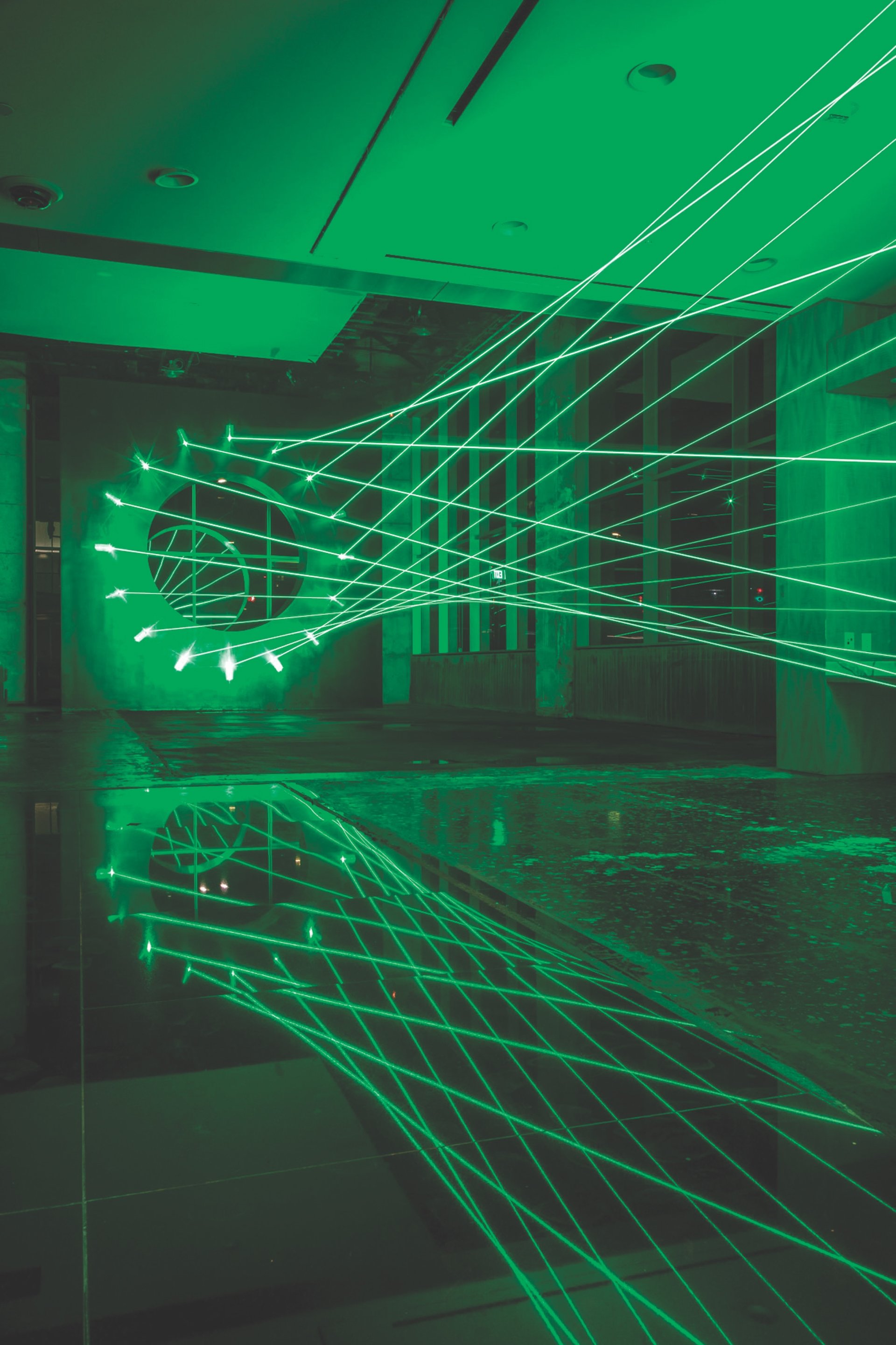 Particulates, originally commissioned for Dia Art Foundation, has lived many lives. Its hyperboloid shape, which Rita McBride describes as mathematically “perfect” for load bearing, looms large in the artist’s practice; her best-known public work, 2011’s towering 170ft sculpture Mae West, memorialises its formal proportions in Munich, Germany. Particulates grew out of McBride’s Portal (2016), a laser installation designed for the Liverpool Biennial as a “wormhole” escape from the long shadow of Thatcherian austerity. Particulates builds further upon that speculative sense of wonder; composed of high-intensity laser beams, water molecules and dust particles dancing mid-air, its third iteration at the Hammer both reflects and charges its environment with the ambient force of a film set, glowing from the mouth of a dark, 1960s bank vault as it materialises before the viewer’s eyes.
