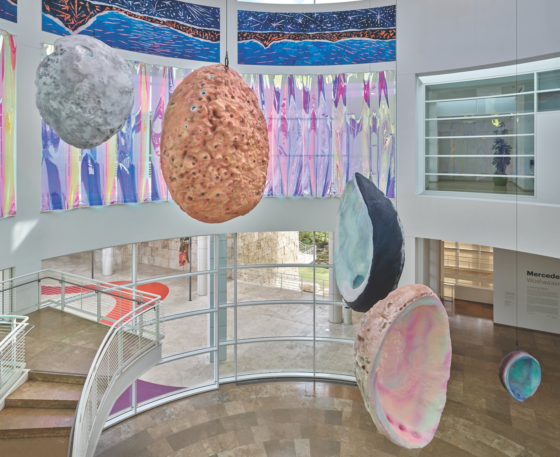 Mercedes Dorame, a Los Angeles-based artist of Gabrielino-Tongva heritage, engages with her ancestry to explore themes around cultural construction. Her installation Woshaa’axre Yaang’aro (Looking Back) (2022)—the inaugural project of the Getty Museum’s Rotunda Commission series at the Getty Center—comprises a series of luminescent suspended sculptures that evoke abalone shells and elements of the Los Angeles coastline. The work honours the Tongva, one of the tribes that originally inhabited the Los Angeles Basin and the Southern Channel Islands.