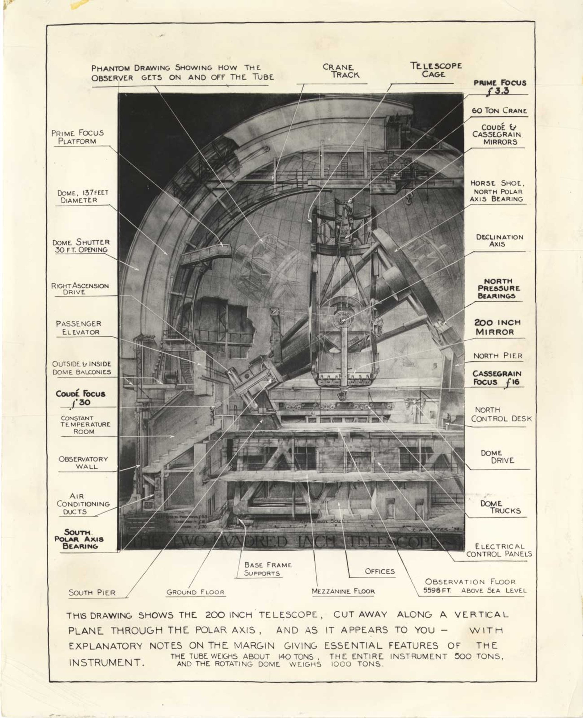 Crossing Over incorporates work that artists made and showed at Caltech, alongside images made by scientists and artist-made renderings of scientific discoveries and speculative illustrations. It spans five Caltech campus sites and begins in the Robinson Laboratory of Astrophysics, which was built with a dome for a telescope pointed at the sun. The exhibition starts with an image of the sun, projected from that telescope on to frosted glass, and proceeds to trace, through images and objects, the history of the Palomar Observatory. Designed in the 1920s by George Ellery Hale, the observatory was famous even before its 1948 completion. The exhibition includes intricate 1930s pencil and ink drawings by Russell Porter, an architect and amateur telescope builder, including a cutaway drawing of the not-yet-built 200in telescope.