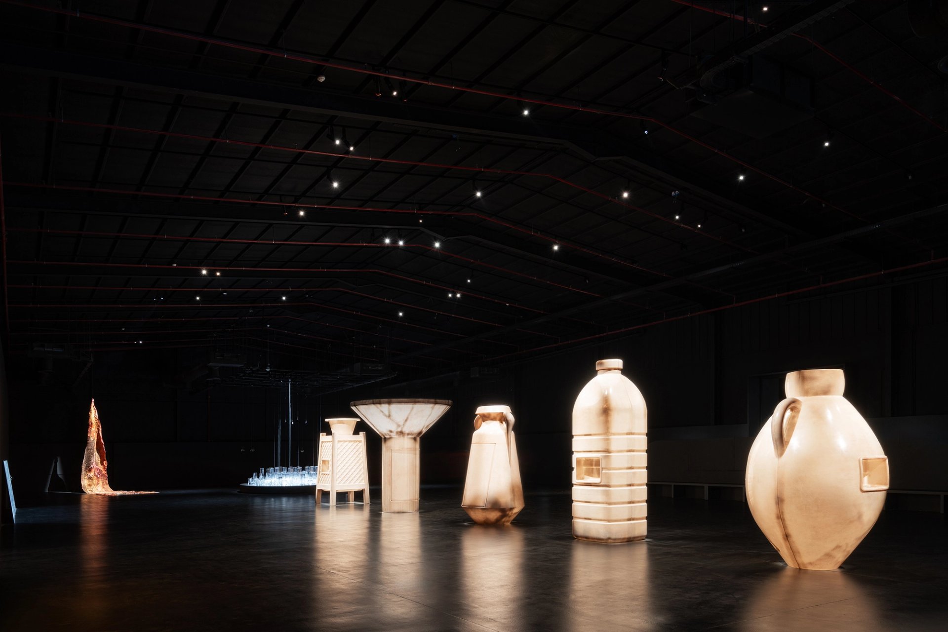 In another dimly-lit room, five enlarged types of water containers, resembling landmarks, glow in the dark. The sculptures have been conceived by the Kuwaiti-Puerto Rican sculptor and filmmaker Alia Farid and began as the series In Lieu Of What Is in 2019 on the Iraq-Kuwait border. "Their reflective, glass-like surfaces radiate a fragility that invokes the complexities of freshwater resources in Kuwait," according to a text published by the biennale.