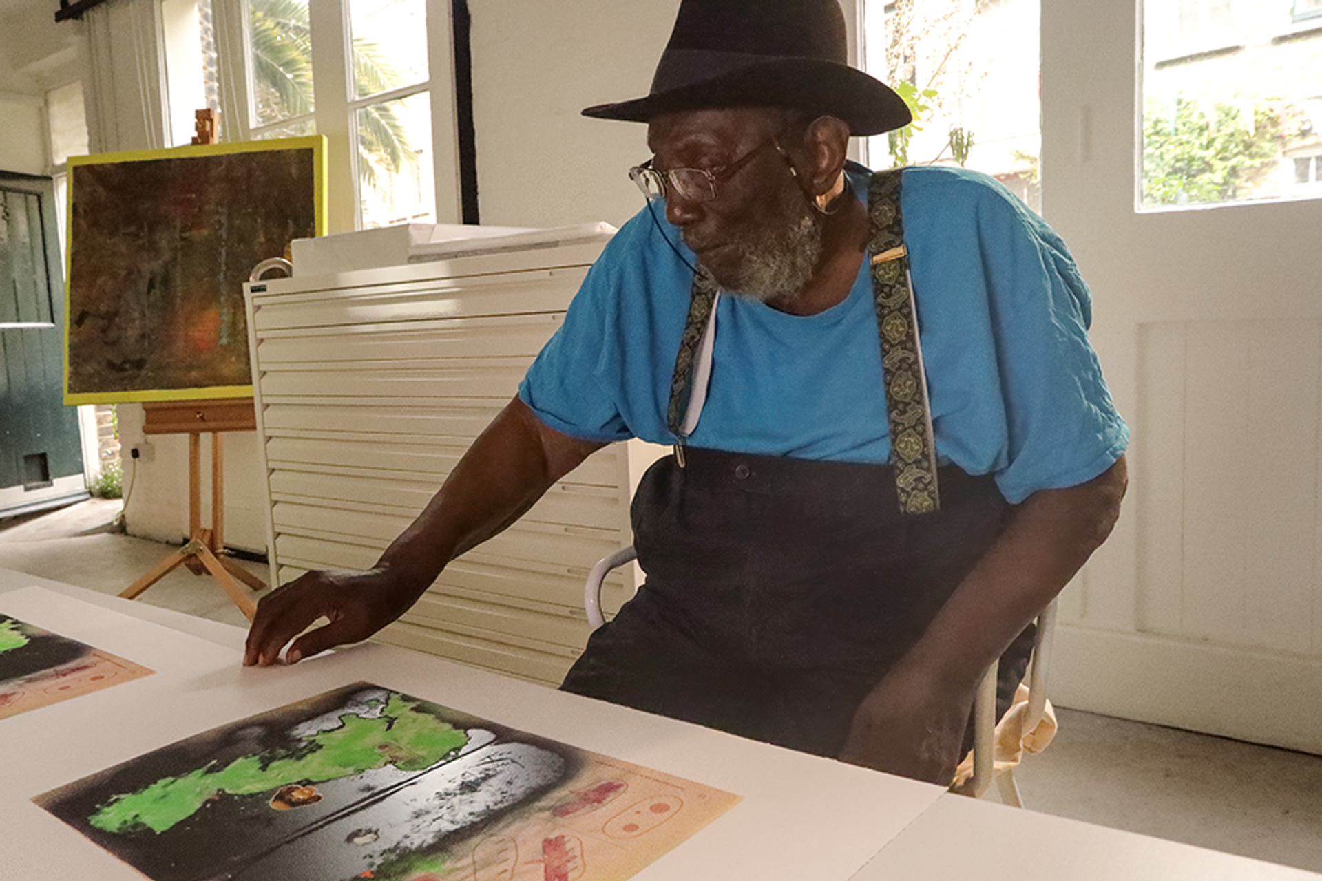 Frank Bowling proofing prints of Understanding Frank (2023)