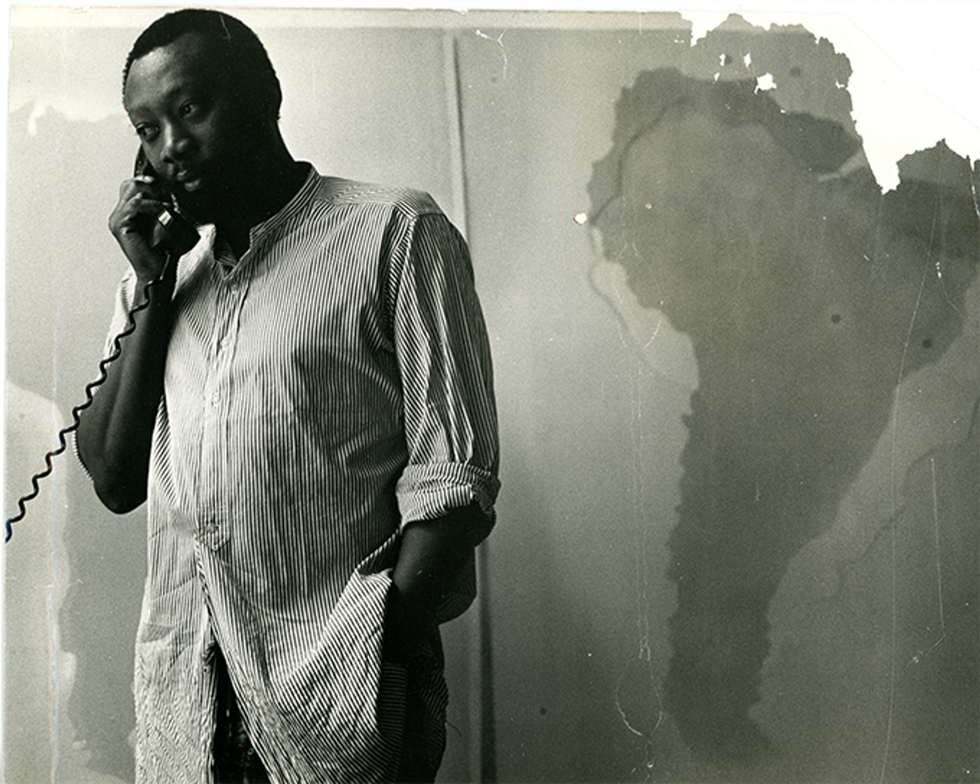 Black and white photograph of Frank Bowling in his Broadway studio in front of a map painting, by Tina Tranter