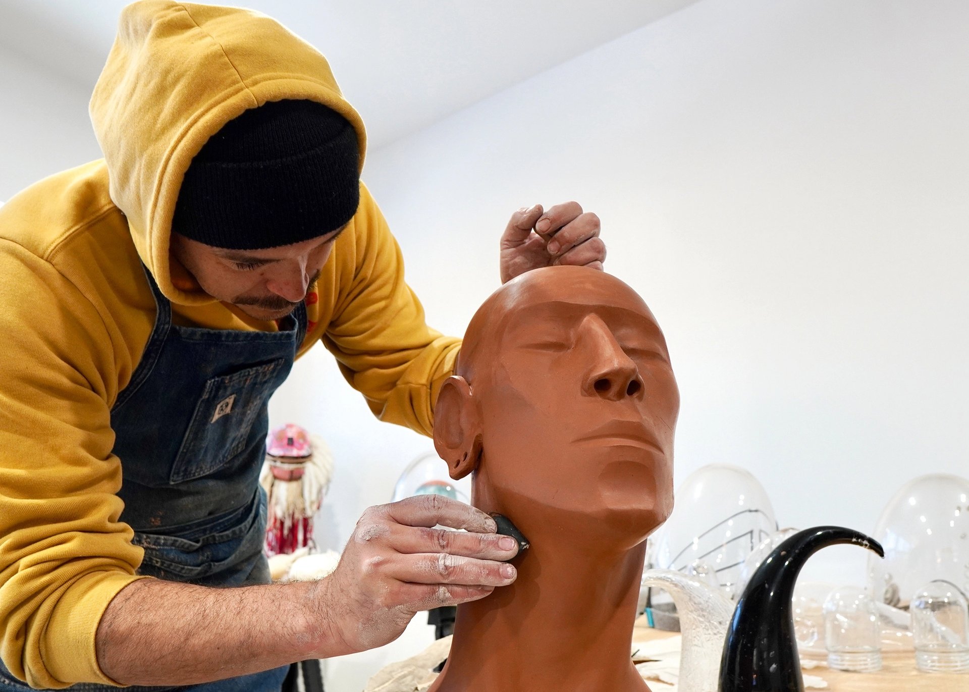 The spaceman: Luger in the studio creating a clay head for Sovereign, part of his Breath(e): Toward Climate Change and Social Justice exhibition