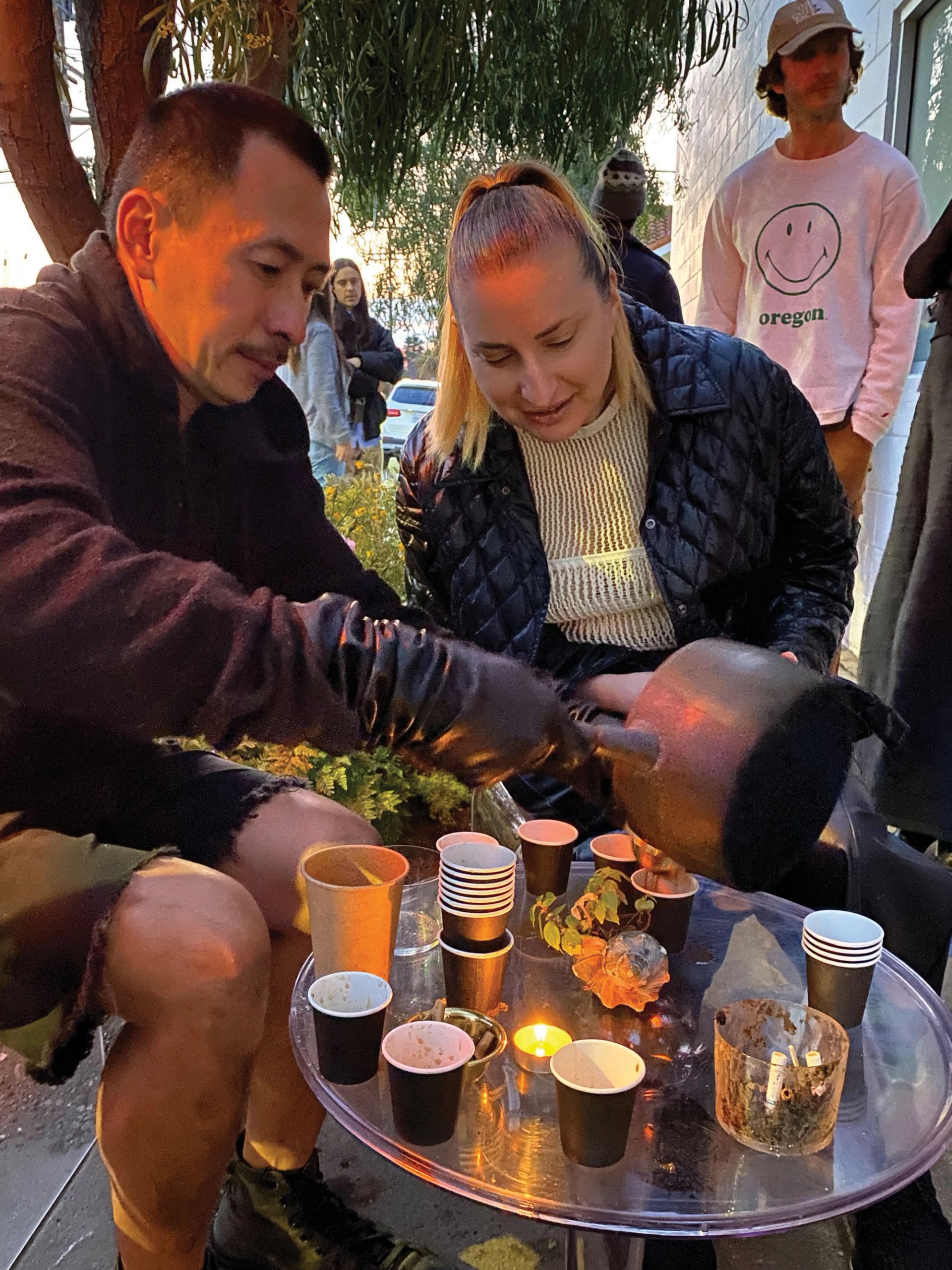 On Tuesday, the artist Terence Koh inaugurated [Room], the new project space of the Hollywood gallery Make Room, with an understated but surreal sunset performance. “I’m going to make a fresh pot of coffee, if you’d like to join me,” he said, inviting visitors to follow him into an immersive installation. Over the past few weeks, Koh has transformed the small 16ft-by-9ft space into a cave with walls of packed, still-wet earth, moss and the dim light of a red lightbulb. Inside, a small gas stove nested in a pile of branches burned like a campfire continuously. Dressed unassumingly in black, he knelt on the earthen floor and boiled water, adding ingredients he pulled from the walls of the cave. Outside on the pavement, under the amber glow of a lamp strung from a tree, Koh sat at a makeshift café of acrylic stools and proceeded to serve coffee out of tiny paper cups, a gesture that felt both generous and intimate. The coffee was aromatic and delicious. The performance and installation, called KOHFEE, mark the first of [Room]’s site-specific and experimental artist projects. Koh will serve up a second performance of his earthy coffee shop on Saturday from 10am to 4pm.