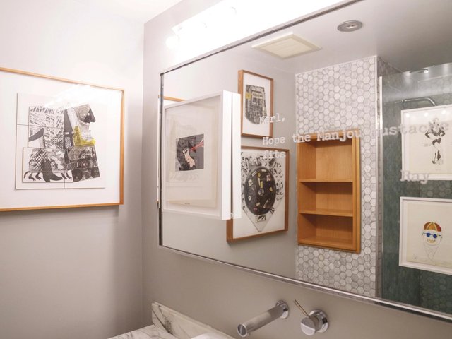 One of the most memorable stands is Foussard’s, not only because of the cement-like treatment of its walls but also the two artists that she features. Angelica Yudasto has created ethereal drawings floating in layers of kiln-formed glass, while Jiwon Rhie has made a slapping machine mounted on an outside wall—a kinetic sculpture of a padded hand that swings around to smack you in the face. At one point, Rhie bends down to demonstrate, putting her cheek in line with the hand. “Don’t worry,” she says. “It’s very gentle.”