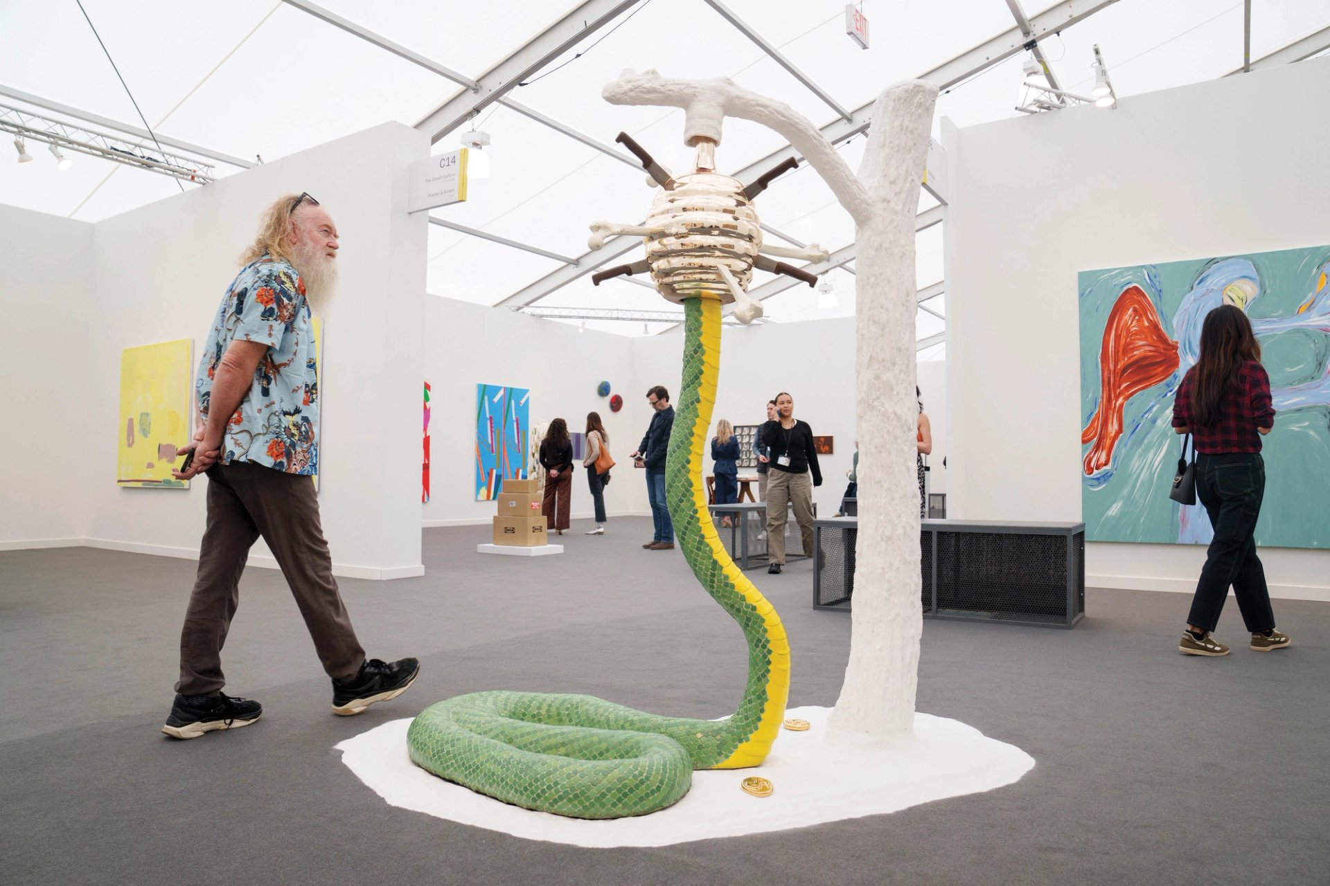 While the word “zoo” could be used to describe the crowded energy at any art fair, the term is particularly fitting for Frieze Los Angeles this year, where animals feature prominently in more stands than one might expect. In the veritable menagerie of works in all manner of media, there are several sculptures with snakes, fish, dogs, boars, rabbits and a variety of birds that especially catch the eye.