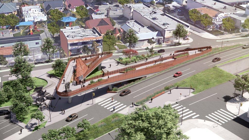 Sankofa Park (shown rendered), which will also feature works by Charles Dickson, Maren Hassinger and Artis Lane. Works by artists including Alison Saar and others will be located elsewhere in the area Rendering by Perkins & Will; courtesy of Destination Crenshaw