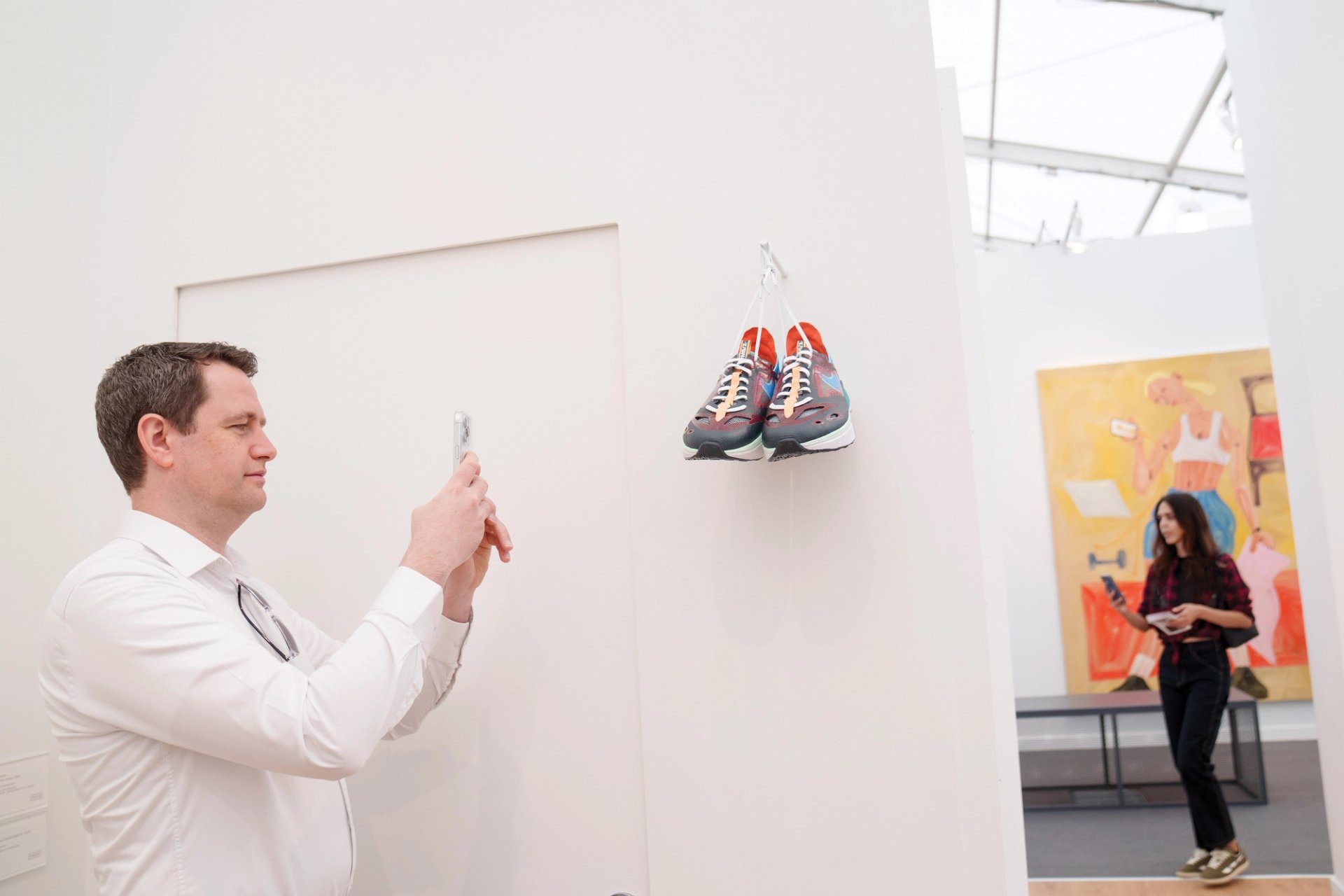Jeff Koons saw 125 of his miniature sculptures land on the moon this week aboard the Nova-C (Odysseus) lunar craft. Koons seems to have also made the perfect weighted footwear for astronauts: his Nike Sneakers (N110 D/MS/X) (2024, pictured above) made from polychromed bronze and weighing an impressive 11kg. These replicas of Nike’s $160 shoes are on display at the Pace stand and have already sold for $750,000. The gallery would not say who bought them, but with the basketball superstar LeBron James perusing the fair on Friday, maybe it was one small step for LeBron, one giant pay day for Jeff.