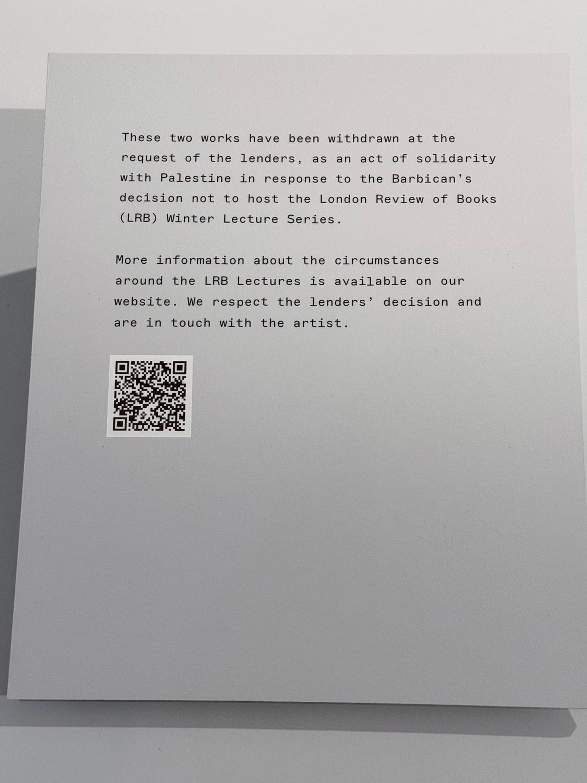 The Barbican’s team have now placed a sign on the plinth where the two Pettway works had been installed. It reads: “These two works have been withdrawn at the request of the lenders, as an act of solidarity with Palestine, in response to the Barbican’s decision to not host the London Review of Books (LRB) Winter Lecture Series.” Postcards depicting one of Pettway’s quilts have also been removed from the Barbican’s gift shop.