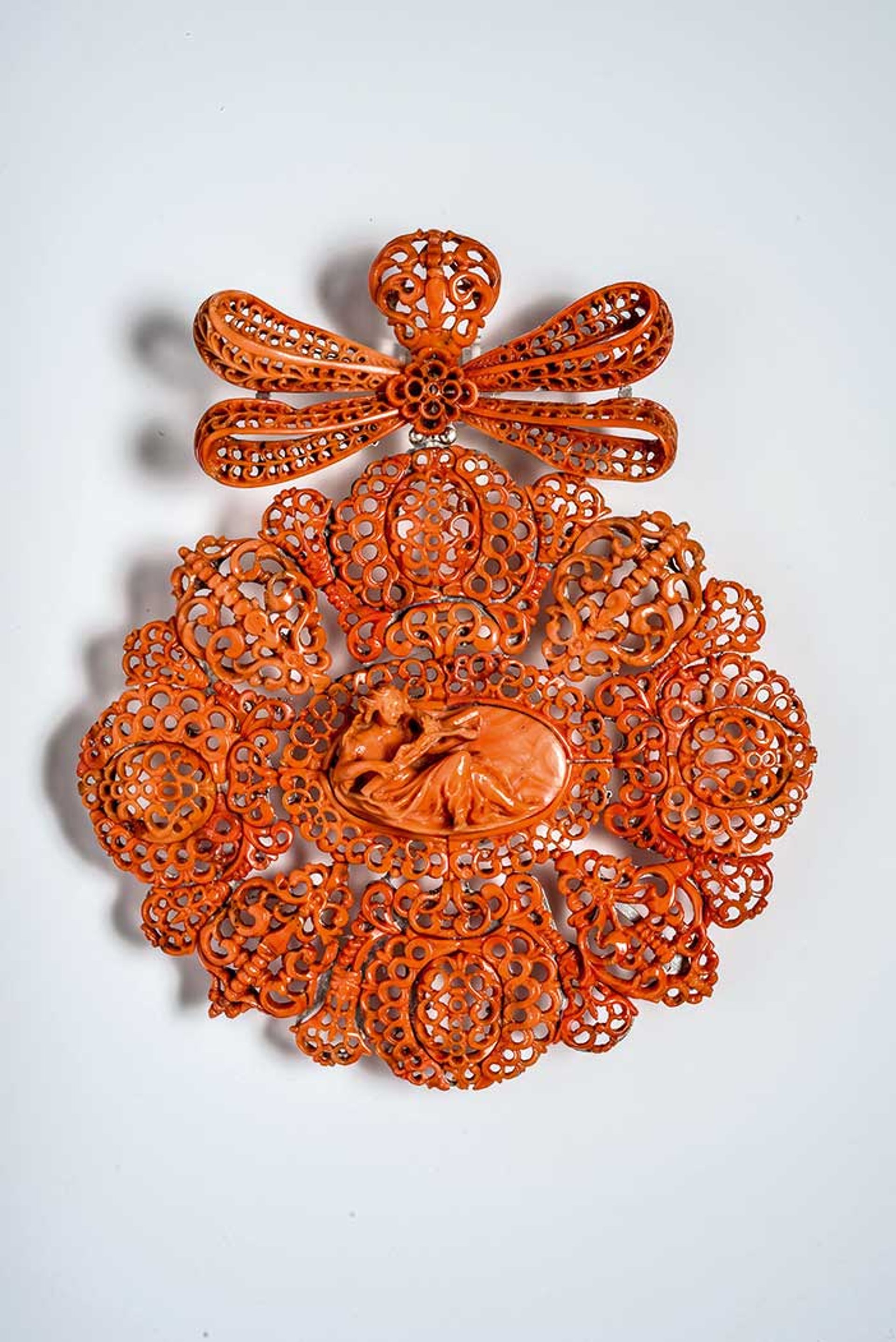 A capezzale is a devotional object, often placed above or beside a bed or worn as a personal adornment. This 20cm-wide pendant made of coral and silver was created in Sicily and shares similarities of design with capezzali made in the Sicilian city Trapani. However, it is closer in style to Spanish designs of the wearable jewel known as rosa de pecho, and the central image—Mary Magdalene holding the cross—was a feminine subject of devotion more in accordance with Spanish tastes. “This makes the piece rare and extremely interesting for further research, as [it] all leads [us] to believe that it was manufactured for a Spanish commissioner, probably a woman, for a private chapel,” says the gallery director Deborah Elvira. The piece was purchased at auction from a private collection in Spain in 2023.