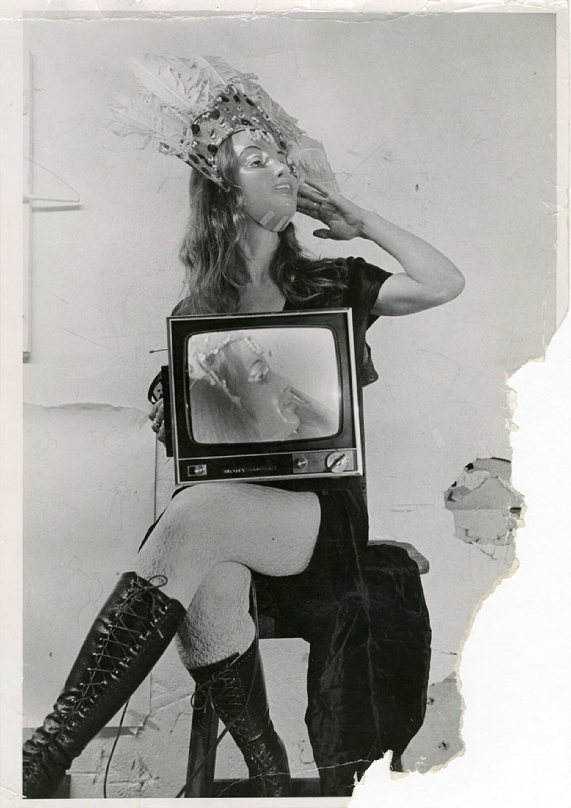 Jonas posing for an unrealised poster for a performance of Organic Honey’s Visual Telepathy at LoGiudice Gallery in New York in 1972 Photo: Richard Serra; © Joan Jonas/Artists Rights Society (ARS), New York