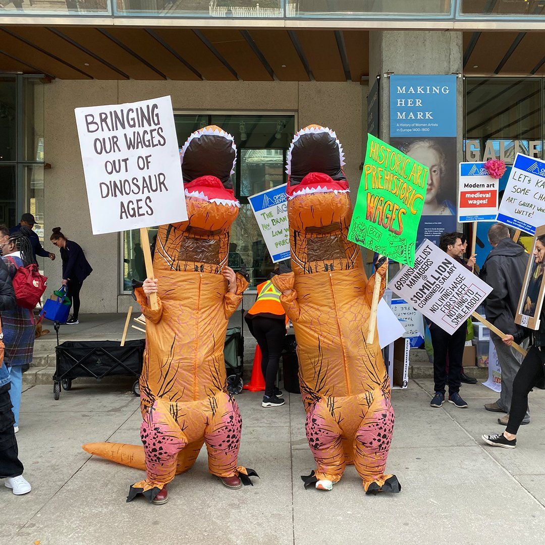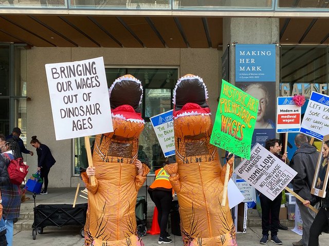 Striking Members of the union include assistant curators, archivists, food and hospitality staff, researchers, technicians, carpenters, electricians, instructors, designers and visitor services staff. Rallying outside the museum on Tuesday, they held signs with messages including “Show Me the Monet”, “Modern Art, Medieval Wages” and “The Arts matter, so do we!”
