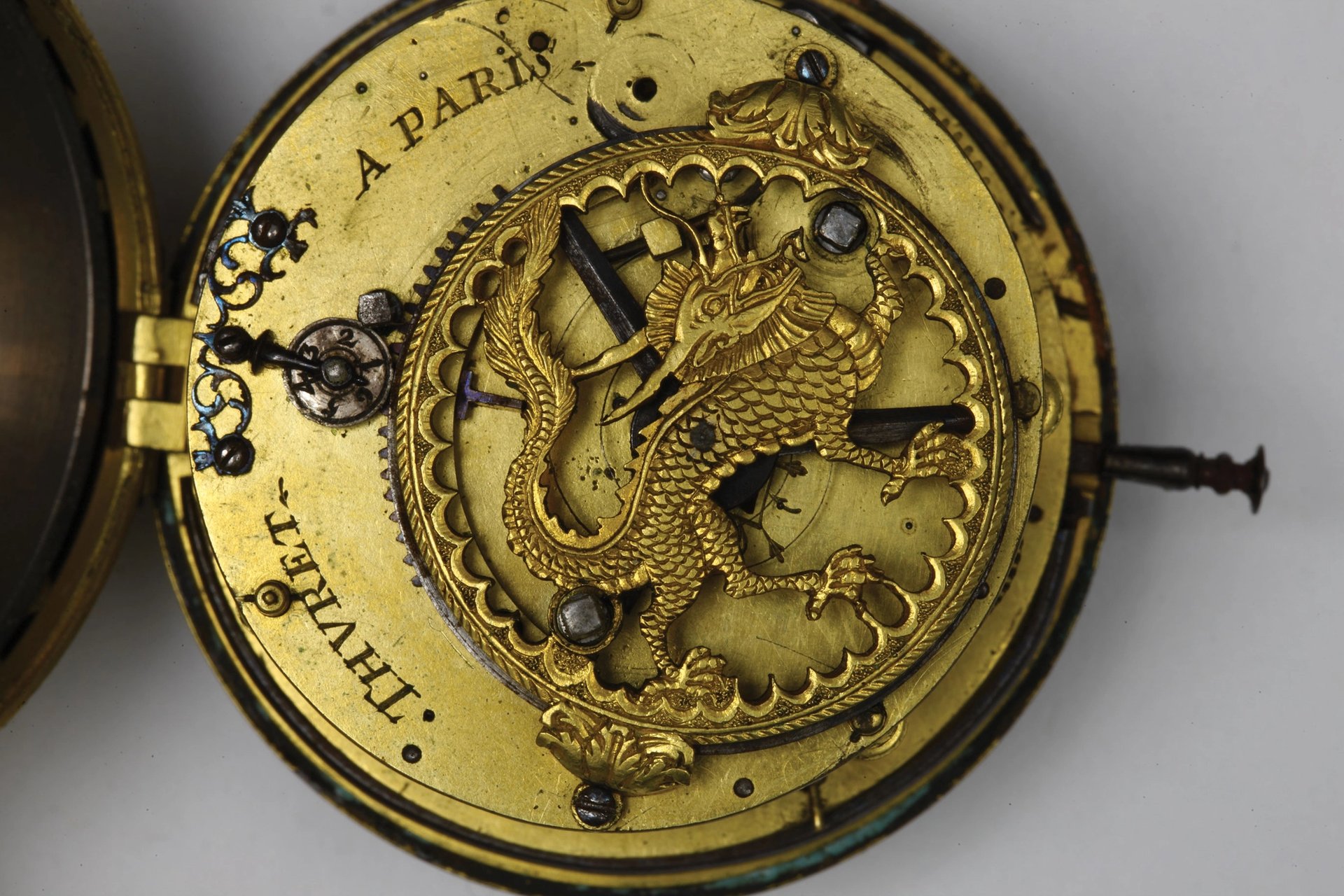 French and Chinese craftsmanship also combine in a Palace Museum pocket watch. The 17th-century piece, made in Paris’s Thuret workshop, was most likely a gift to Emperor Kangxi from Louis XIV, whose portrait is featured on the back of the gold-plated copper case. Though French on the outside, on the inside an elaborate gold-plated dragon was inserted in China to protect the watch spring.