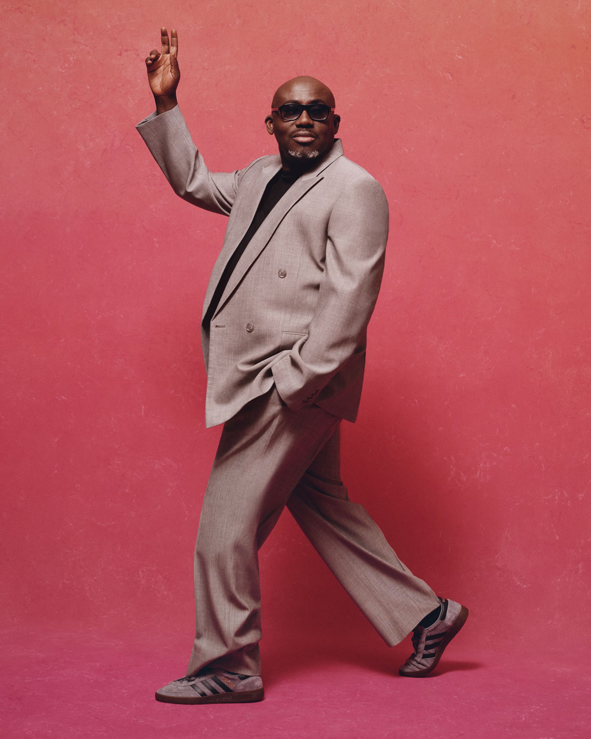 Edward Enninful wears a suit by Phoebe Philo bespoke; T-shirt by American Vintage; trainers by Adidas; glasses by Cutler and Gross Photography by Nadine Ijewere; stylist Susan Bender Whitfield; stylist assistant Talitha Howden; makeup by Joshua Duncan; grooming by Ian Hoyos at Champs Barbers