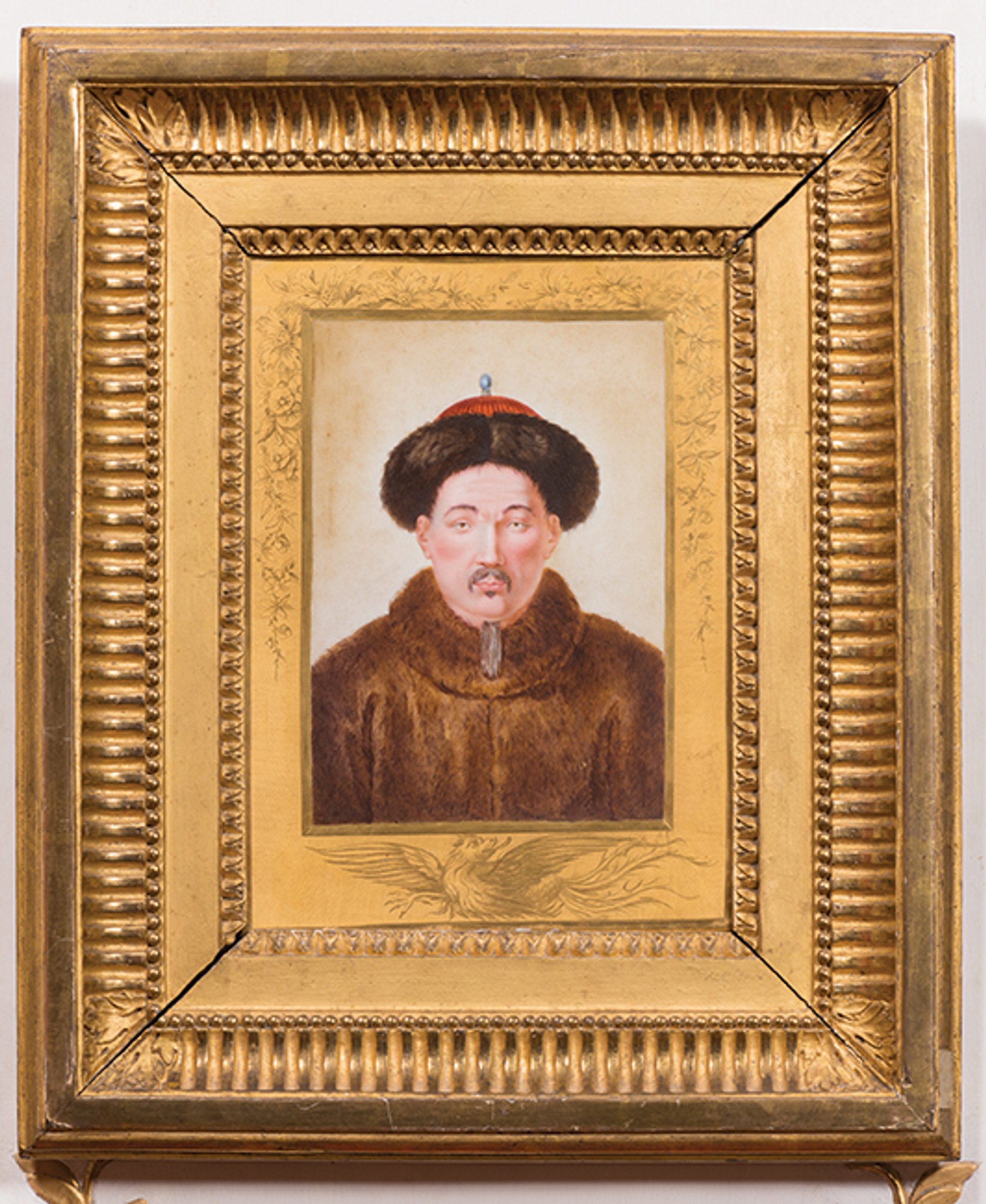 The French monarchs’ perennial reverence for their Chinese confrères is recalled in a fusion work—Plaque depicting the Emperor of China, in which Charles-Eloi Asselin, a painter at the Sèvres Porcelain Manufactory outside Paris, depicted Kangxi’s successor, Emperor Qianlong, on hard-paste porcelain. Based on a drawing by an Italian Jesuit at the Chinese court, the portrait, from around 1776, is presented in a gilded-wood frame decorated with Chinese motifs. It had such a high standing at the court of Louis XVI that it was included in the king’s private Versailles apartments.
