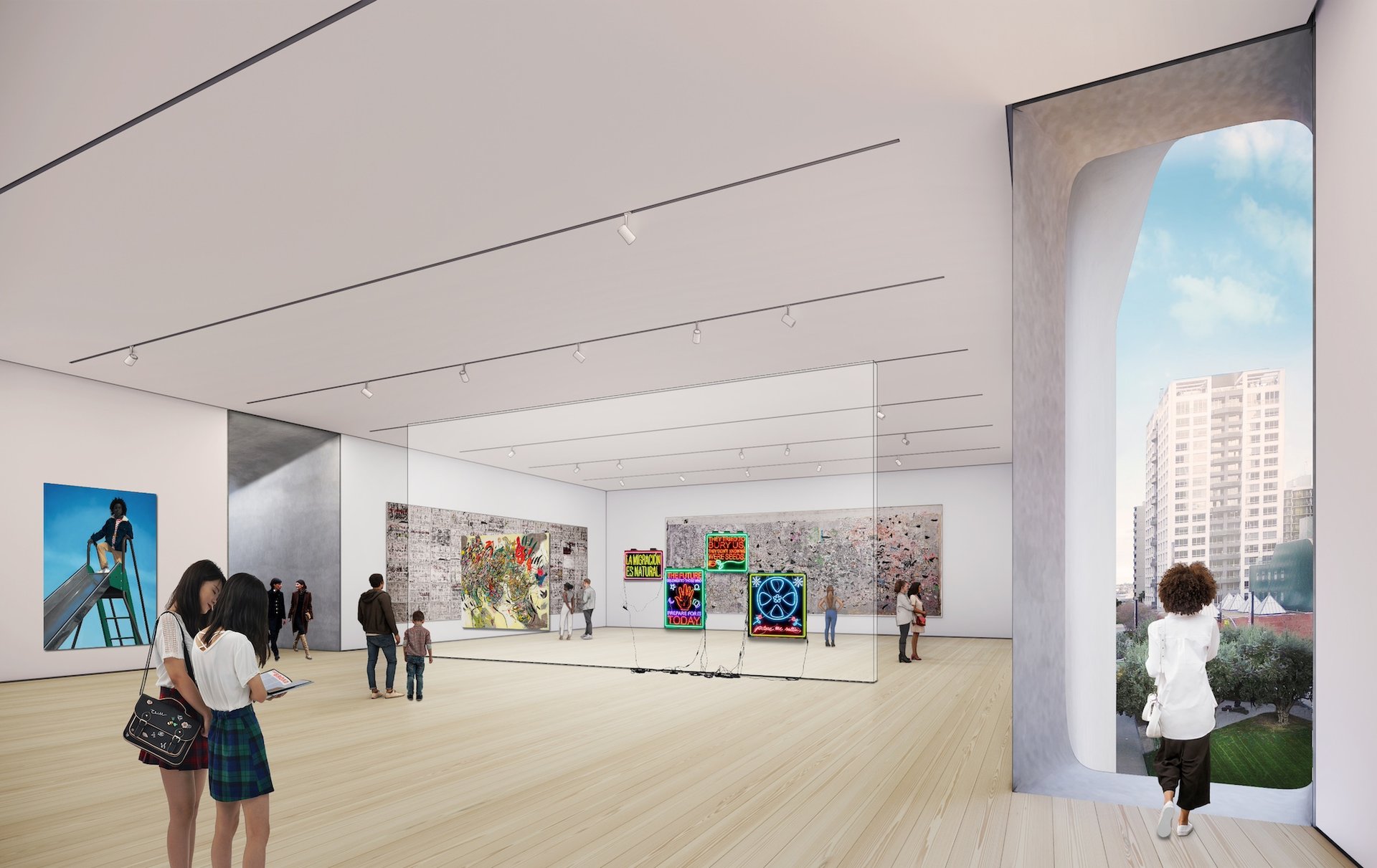 Rendering of a future gallery in the expanded Broad, featuring artworks from the Broad collection, from left to right: Amy Sherald, Kingdom, 2022; Elliott Hundley, Changeling, 2020; Patrick Martinez, Migration is Natural, 2021, picture me rollin’, 2016, Psychic Friends (Malcolm X), 2022, and They Tried to Bury Us, They Didn’t Know We Were Seeds (Dinos Christianopoulos), 2022; and, in the back gallery, Mark Bradford, Corner of Desire and Piety, 2008 and Helter Skelter I, 2007 Courtesy of the artists and The Broad. © Diller Scofidio + Renfro (DS+R)