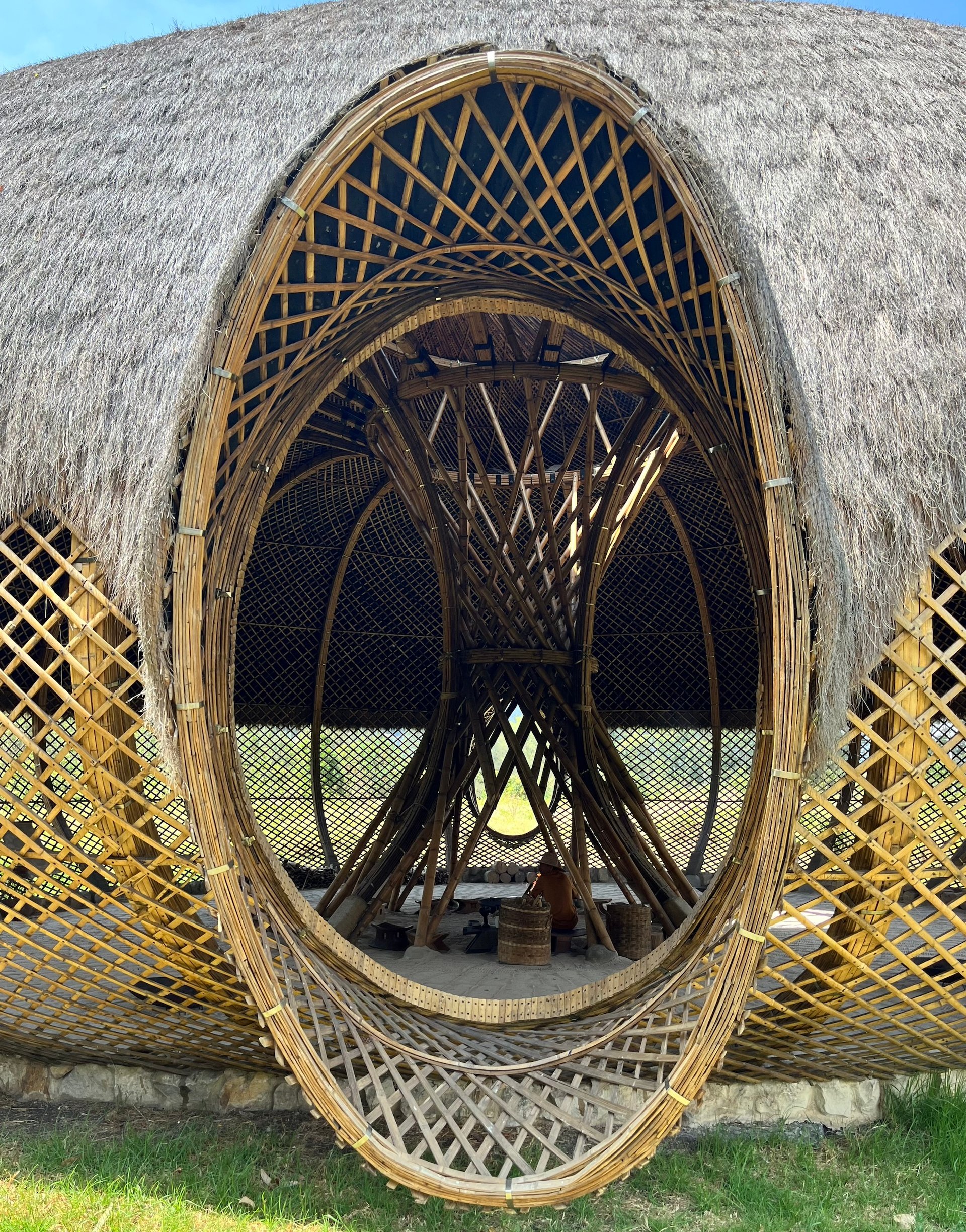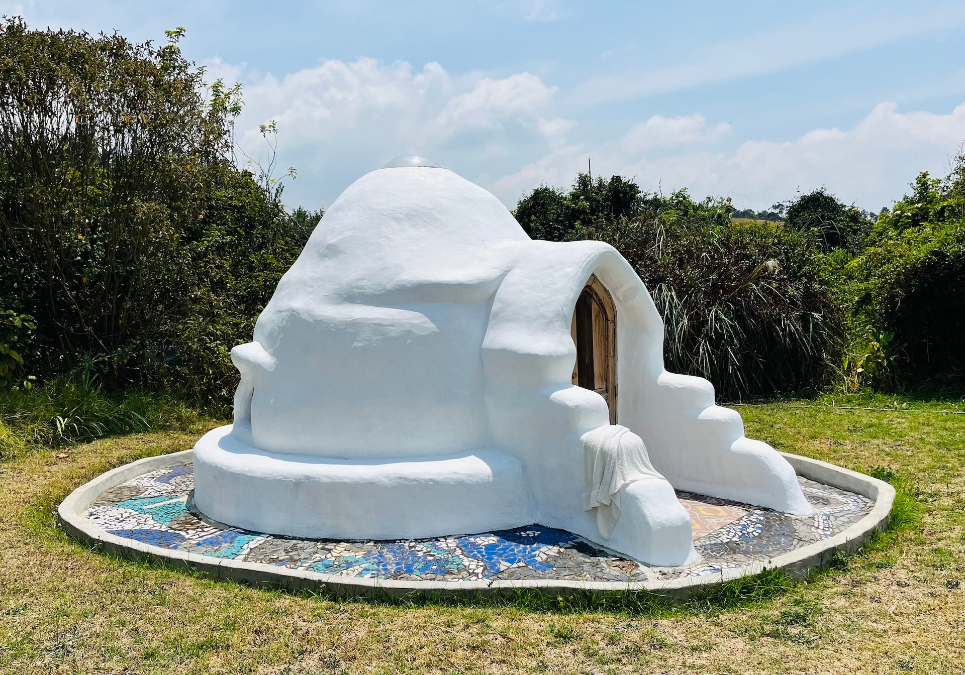 The Centre sits on farmland previously owned by Gutiérrez’s grandfather. Over the past 14 years, the farm has been replanted into a forest and meadowland with unique, fantastical structures dotting the landscape. There are small earthbag buildings that look like massive coil pots—Gutiérrez learned the technique from the Iranian American architectural pioneer Nader Khalili. Other structures are made with earthen bricks and thatched roofs. These are fully functional dwellings, complete with composting toilets, protection from the elements and beautiful frescoes inside. The Centre also has a self-built greywater system, a geodesic-domed office space and a sweeping bamboo structure with a sand floor and burning fire in the middle. Gutiérrez refers to it as a “house of thought”, where visitors can cathartically scatter tobacco leaves into the fire.