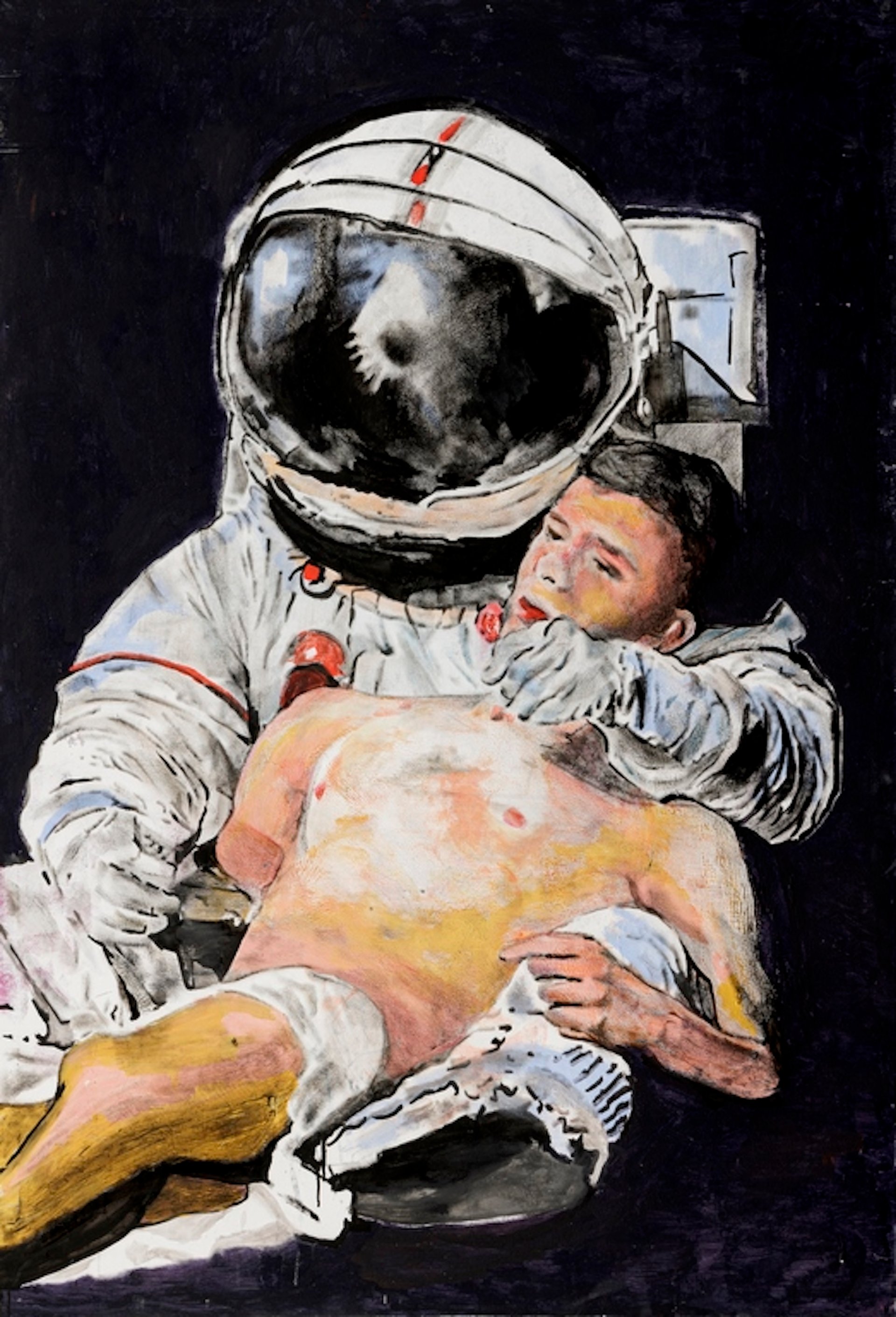 The disputed painting is one of roughly 20 new mixed media works on canvas by Saltini—each showing a contemporary twist on a religious theme—currently on display in the Gratia Plena exhibition. Paraclito (2024) resembles a Pietà but with a figure in a space suit, rather than the Virgin Mary, cradling the body of Christ. INRI (2024), the work that was vandalised on Thursday, shows the figure of Jesus’s nude body splayed on the floor while the head of St Longinus, the Roman soldier who pierced his side with a lance during the crucifixion, is seen from behind as it hovers above his crotch. Organised by the diocese of Carpi, the exhibition opened on 2 March and runs until 2 June.