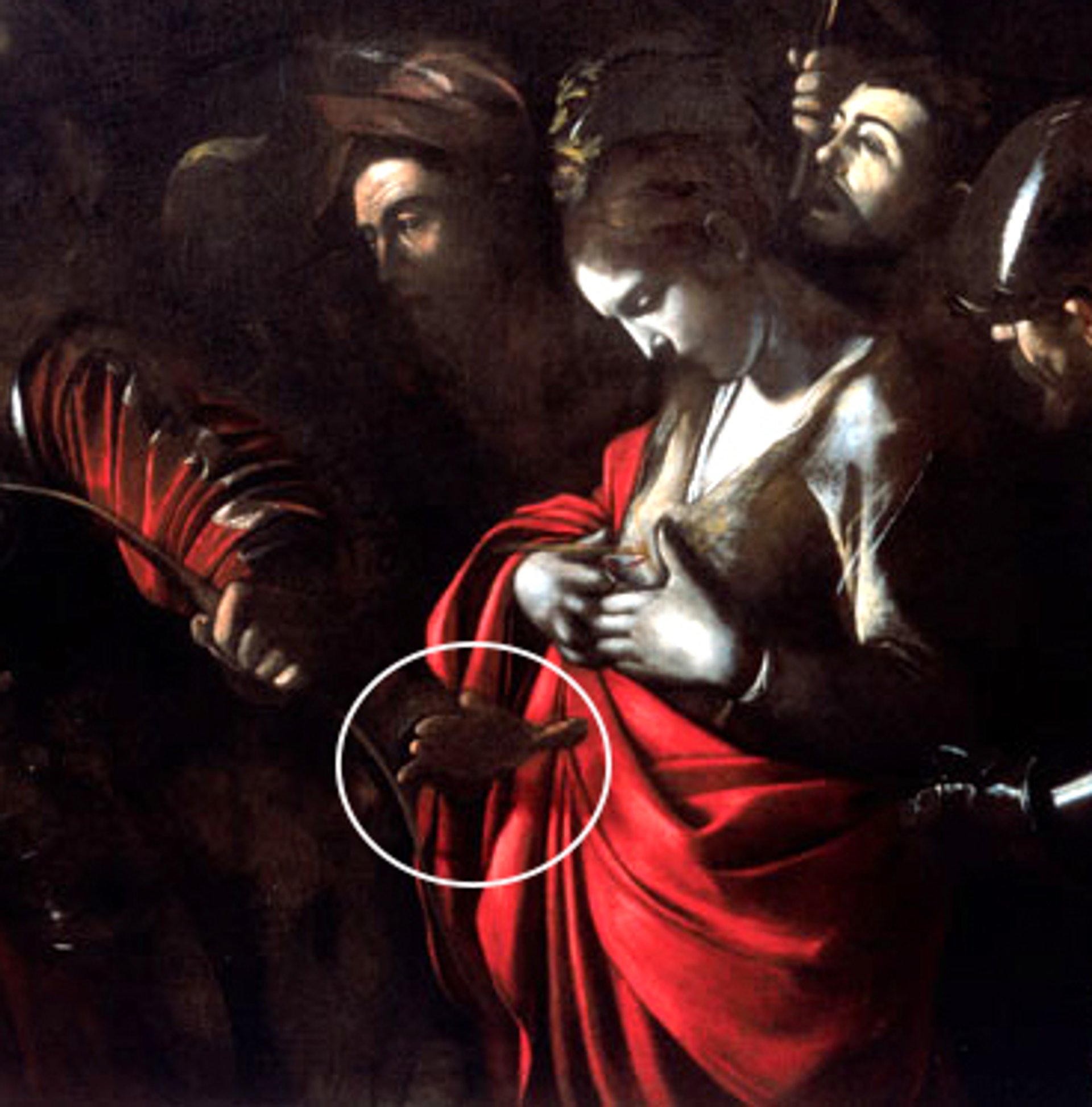Crucially until the last restoration in 2003, a strange shadow was visible in the centre of the saint's cloak. “This was the shadow of the right hand of the figure in the background, on the right of Ursula, which was only made with browns and had all but disappeared after an incongruous, earlier restoration in the 1970s. The restitution of this hand reaching out towards the spectator—the extreme attempt to protect the young woman from torture, the signalling of the instant of the dart's departure—dilates the space of the scene and restores that choral, centripetal arrangement that characterises quite a few of the artist's works after his last flight from Rome.”