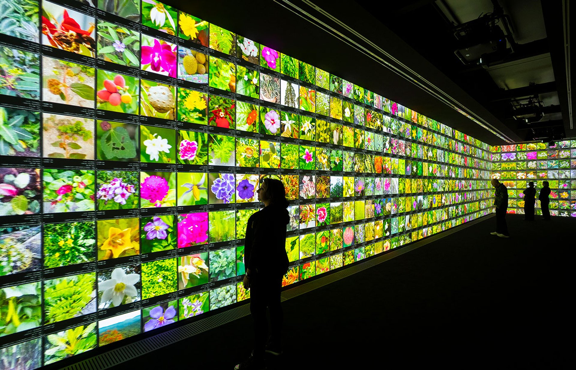 As part of demonstrating process, Anadol displays arrays of some of the millions of source images that his Large Nature Model is trained to turn into text-to-image generative video Refik Anadol, Echoes of the Earth: Living Archive, 2024. Installation view, Serpentine North. Photo: Hugo Glendinning. Courtesy Refik Anadol Studio and Serpentine