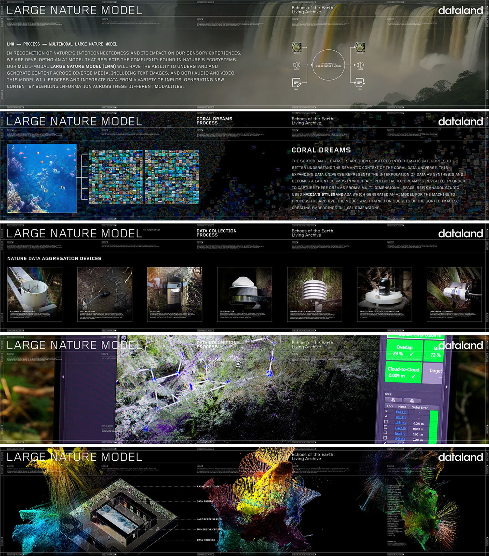 "Showing the ingredients of the medium": sample images from Refik Anadol's data process wall at Serpentine Galleries, London, that introduce the Large Nature Model (LNM) (top), explain the thematic cataloguing of images from institutional archives, describe approaches to aggregating ecological data in nature and show the layout of the show with an isometric model of the gallery Refik Anadol, Echoes of the Earth: Living Archive, 2024. Courtesy Refik Anadol Studio and Serpentine