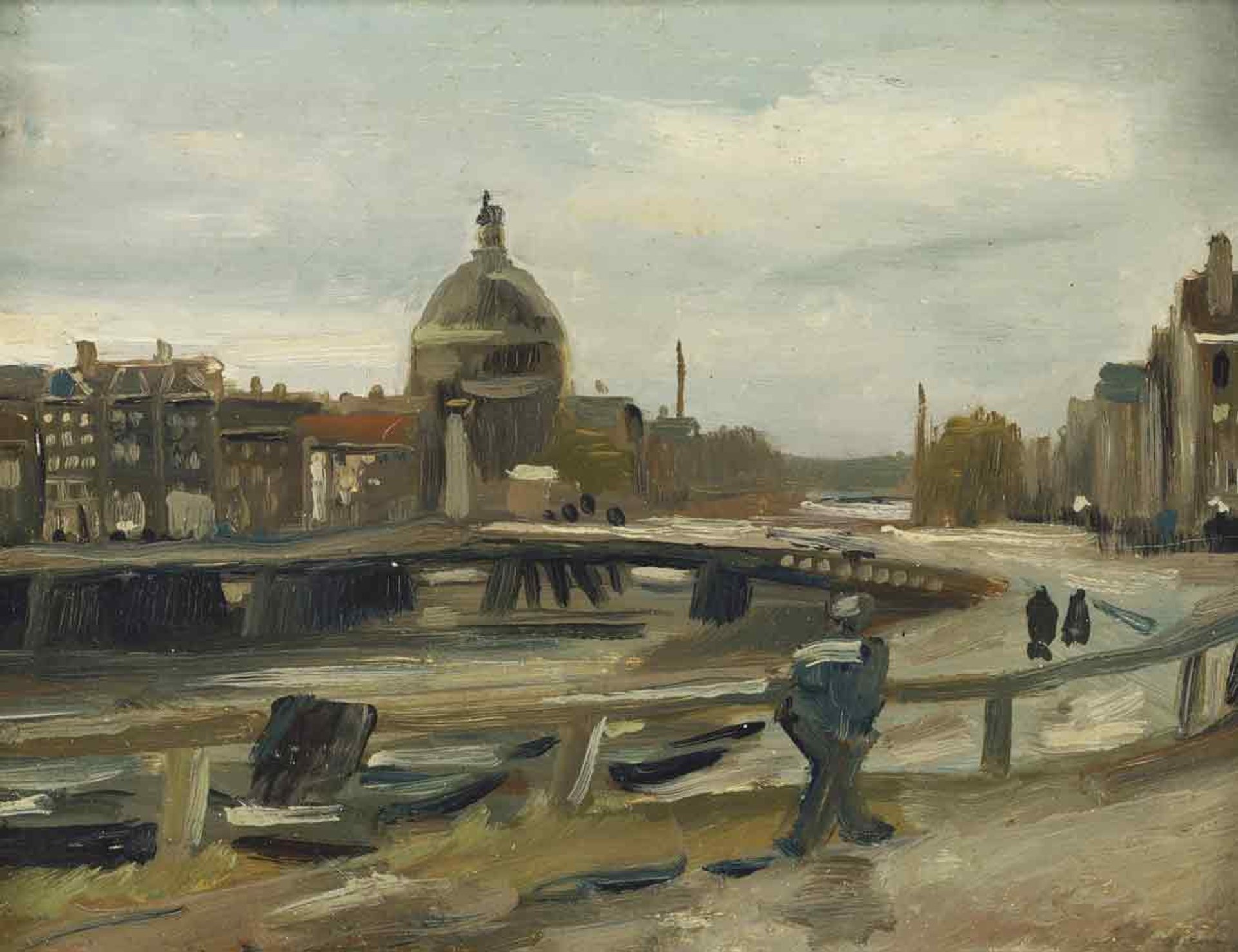 View of Amsterdam from Central Station depicts two bridges over the Singel canal, with the dome of the Koepelkerk (the cupola church is now part of the Renaissance Hotel) in the middle distance. Although “Central Station” appears in the picture’s traditional title, Amsterdam’s grand station was only completed in 1889 and during Van Gogh’s visit trains stopped at a temporary building on the adjacent Westerdok.