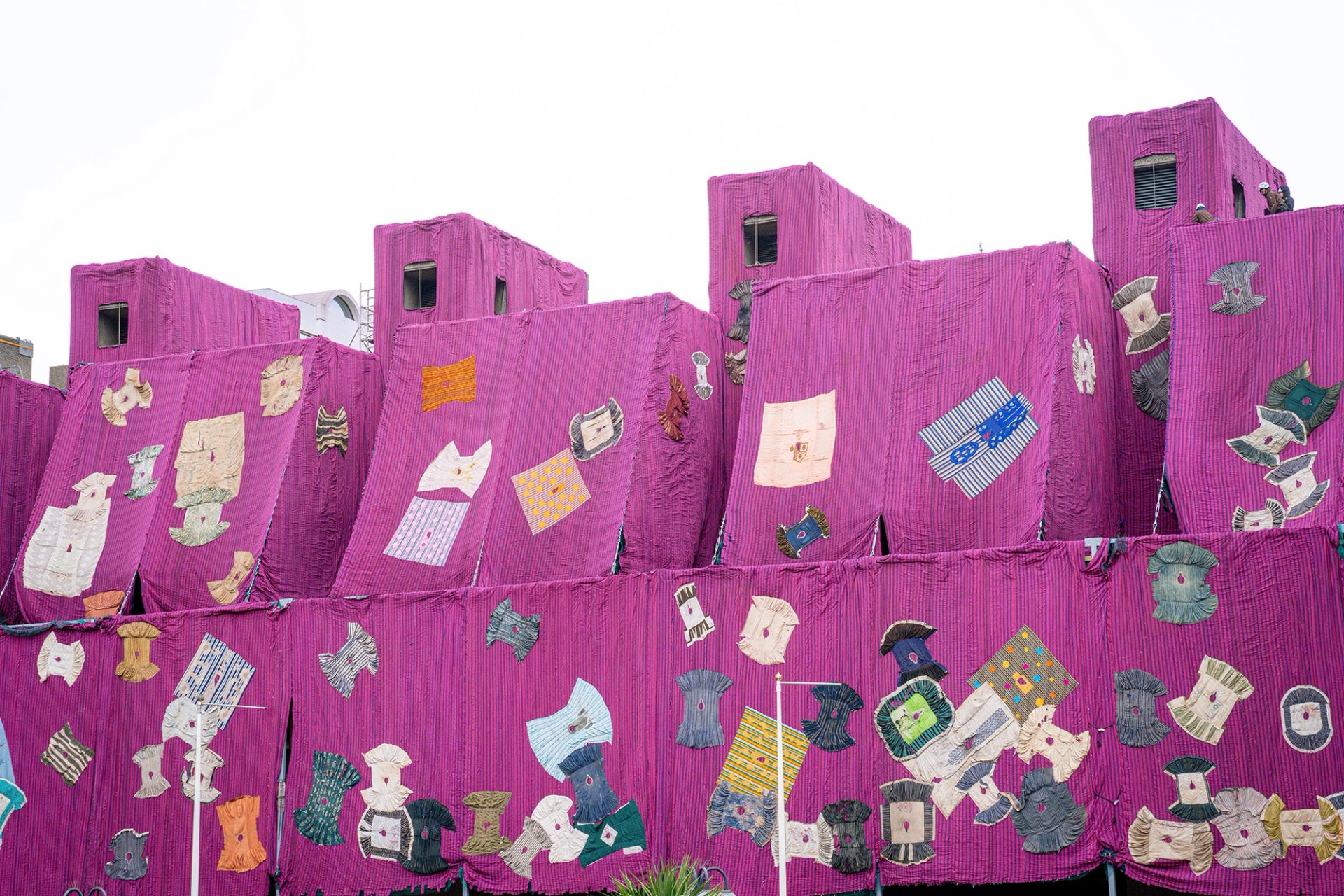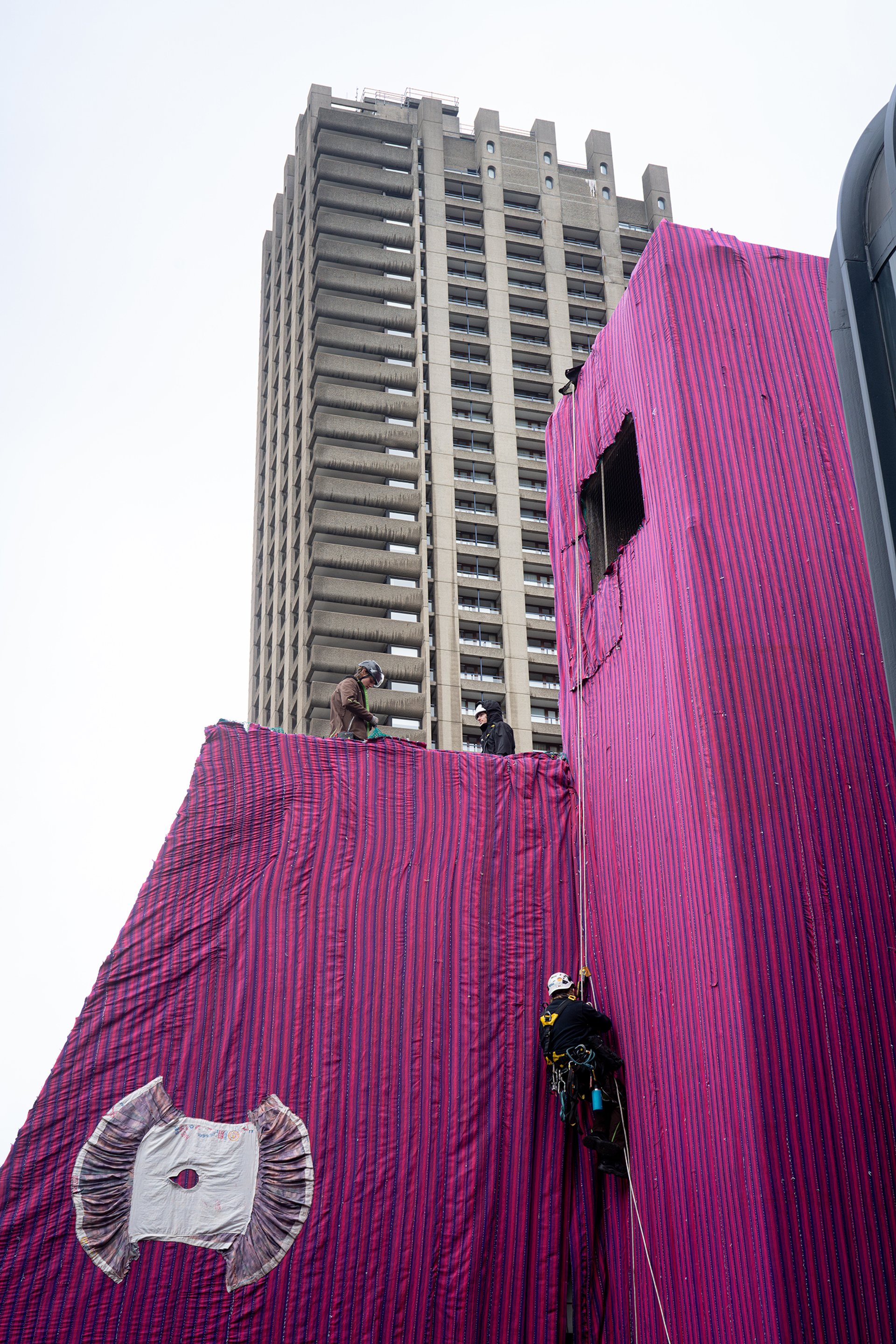 Visitors to the Barbican centre in London will see swathes of pink and purple across the building this spring rather than the usual concrete exterior thanks to the Ghanian artist Ibrahim Mahama. His large-scale public art piece, Purple Hibiscus—made of 2,000 square metres of woven cloth—covers the lakeside façade of the brutalist structure, creating a vivid contrast against the grey building and sky.
