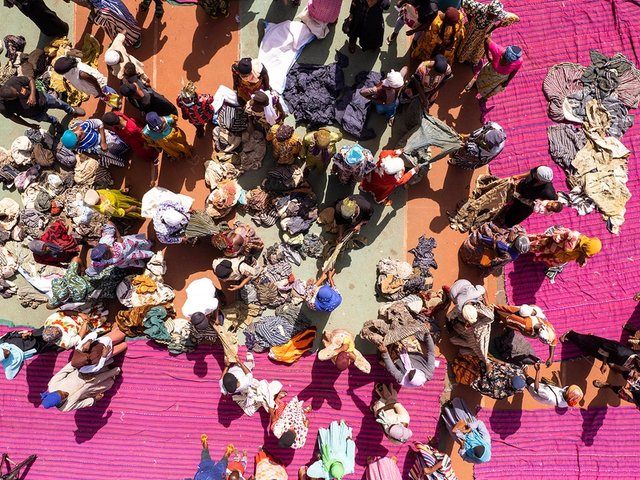 The work was sewn together by more than 1,000 weavers and seamstresses at the Alui Mahama sports stadium in Tamale, Ghana (an accompanying film gives an idea of the scale of the work, showing a plethora of craftspeople knitting the piece together on the football pitch).