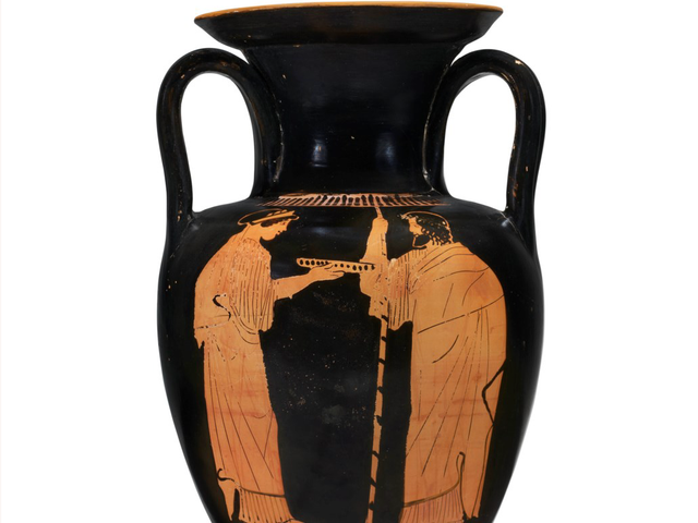 The three vases, all of which date to the 6th century BCE, are an attic cup adorned with images of warriors with a $15,000 to $20,000 estimate, the lid of a lekanis bowl with sphinx figures expected to sell for between $8,000 and $12,000 and a hydra water pot featuring the god Dionysus with a drinking horn with an estimate of $7,000 to $9,000.